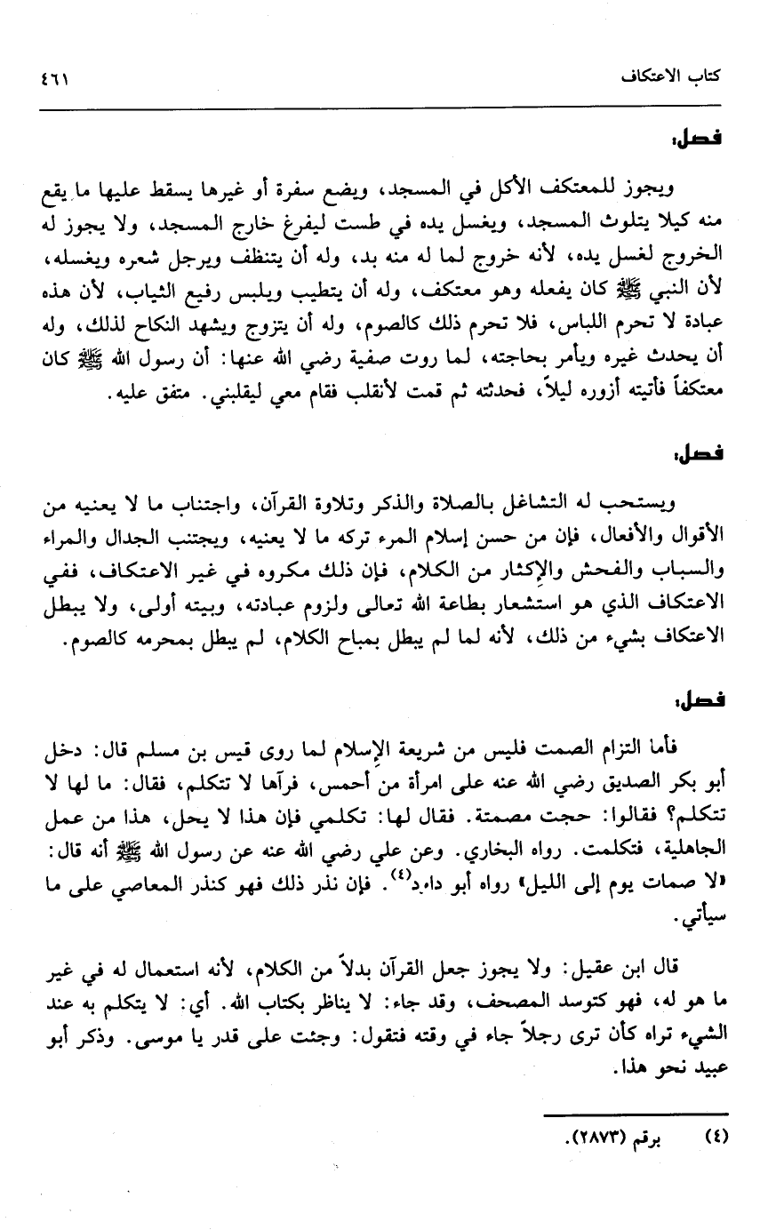 فأما التزام الصمت فليس من شريعة الإسلام لما روى قيس بن مسلم قال: دخل أبو بكر الصديق - رَضِيَ اللَّهُ عَنْهُ - على امرأة من أحمس، فرآها لا تتكلم، فقال: ما لها لا تتكلم؟ فقالوا: حجت مصمتة، فقال لها: تكلمي فإن هذا لا يحل، هذا من عمل الجاهلية، فتكلمت. رواه البخاري. وعن علي - رَضِيَ اللَّهُ عَنْهُ - عن رسول الله - صَلَّى اللَّهُ عَلَيْهِ وَسَلَّمَ - أنه قال: «لا صمات يوم إلى الليل» رواه أبو داود. فإن نذر ذلك فهو كنذر المعاصي على ما سيأتي.
