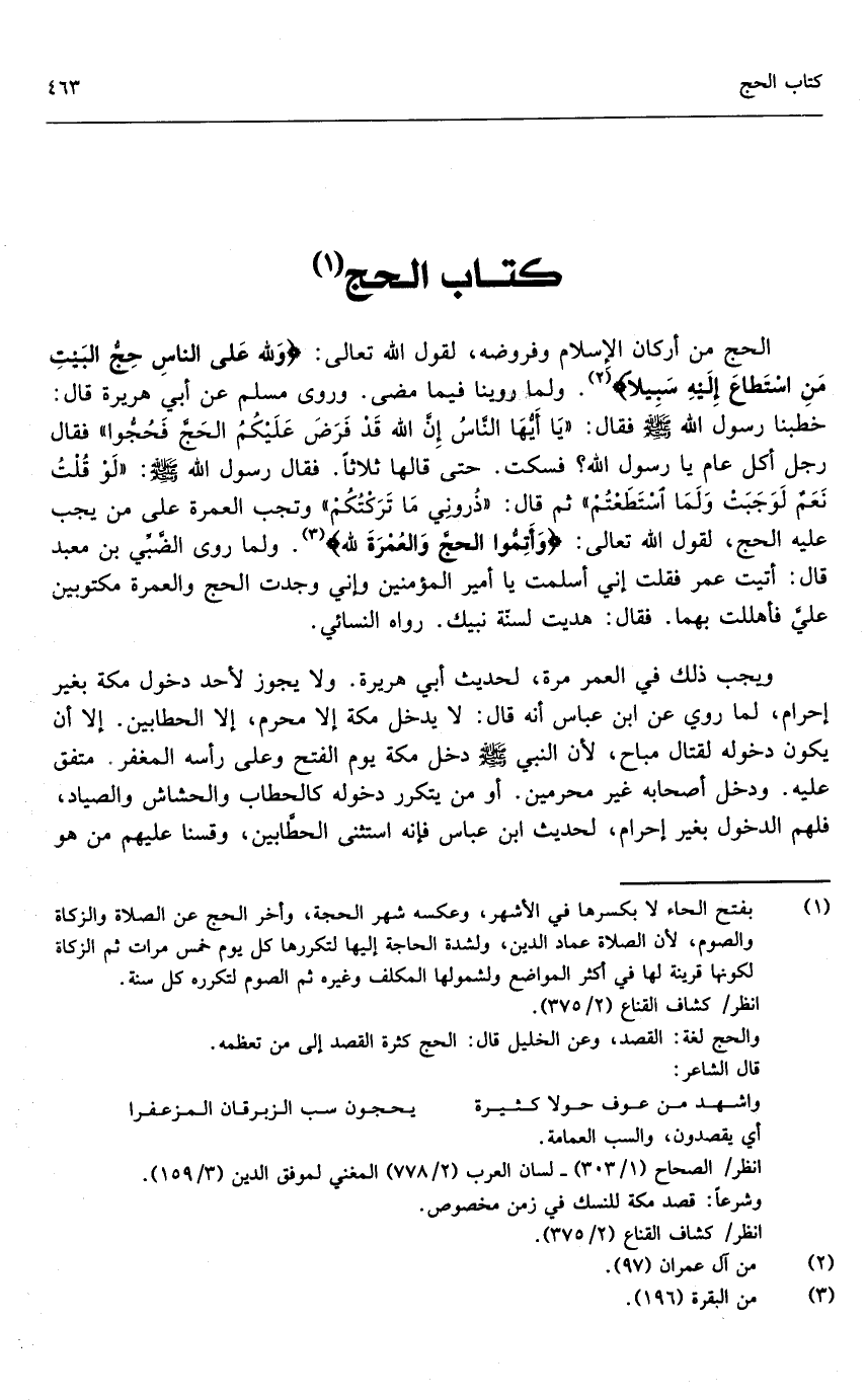 الحج من أركان الإسلام وفروضه؛ لقول الله تعالى: {وَلِلَّهِ عَلَى النَّاسِ حِجُّ الْبَيْتِ مَنِ اسْتَطَاعَ إِلَيْهِ سَبِيلا} [آل عمران: 97] ولما روينا فيما مضى، وروى مسلم عن أبي هريرة قال: «خطبنا رسول الله - صَلَّى اللَّهُ عَلَيْهِ وَسَلَّمَ - فقال: يا أيها الناس إن الله فرض عليكم الحج فحجوا فقال رجل: أكل عام يا رسول الله؟ فسكت. حتى قالها ثلاثاً. فقال رسول الله - صَلَّى اللَّهُ عَلَيْهِ وَسَلَّمَ -: لو قلت نعم لوجبت ولما استطعتم ثم قال: ذروني ما تركتكم» وتجب العمرة على من يجب عليه الحج؛ لقول الله تعالى: {وَأَتِمُّوا الْحَجَّ وَالْعُمْرَةَ لِلَّهِ} [البقرة: 196] . ولما روى الضبي بن معبد قال: أتيت عمر فقلت: إني أسلمت يا أمير المؤمنين، وإني وجدت الحج والعمرة مكتوبين علي فأهللت بهما. فقال: هديت لسنة نبيك. رواه النسائي.