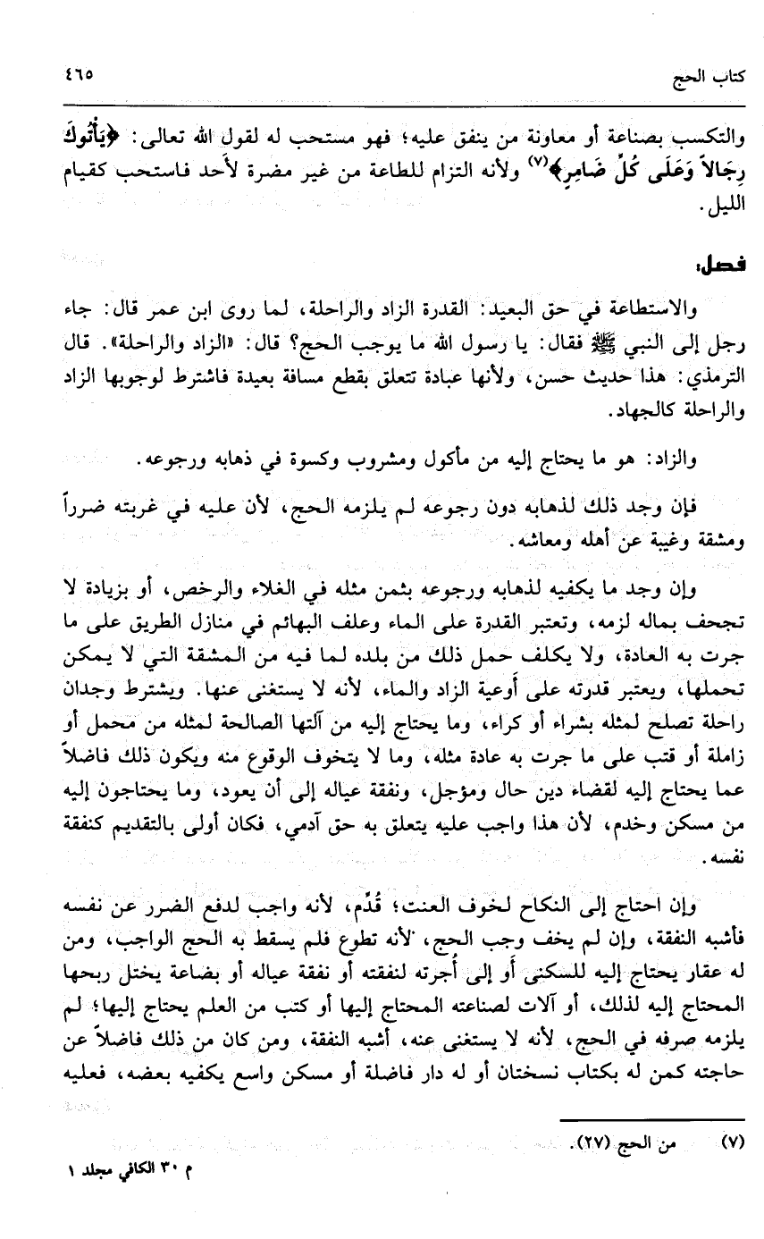 وإن احتاج إلى النكاح لخوف العنت، قدم؛ لأنه واجب لدفع الضرر عن نفسه فأشبه النفقة، وإن لم يخف وجب الحج؛ لأنه تطوع فلا يسقط به الحج الواجب، ومن له عقار يحتاج إليه للسكنى أو إلى أجرته لنفقته أو نفقة عياله أو بضاعة يختل ربحها المحتاج إليه لذلك، أو آلات لصناعته المحتاج إليها، أو كتب من العلم يحتاج إليها؛ لم يلزمه صرفه في الحج؛ لأنه لا يستغنى عنه، أشبه النفقة، ومن كان من ذلك فاضلاً عن حاجته كمن له بكتاب نسختان أو له دار فاضلة أو مسكن واسع يكفيه بعضه، فعليه