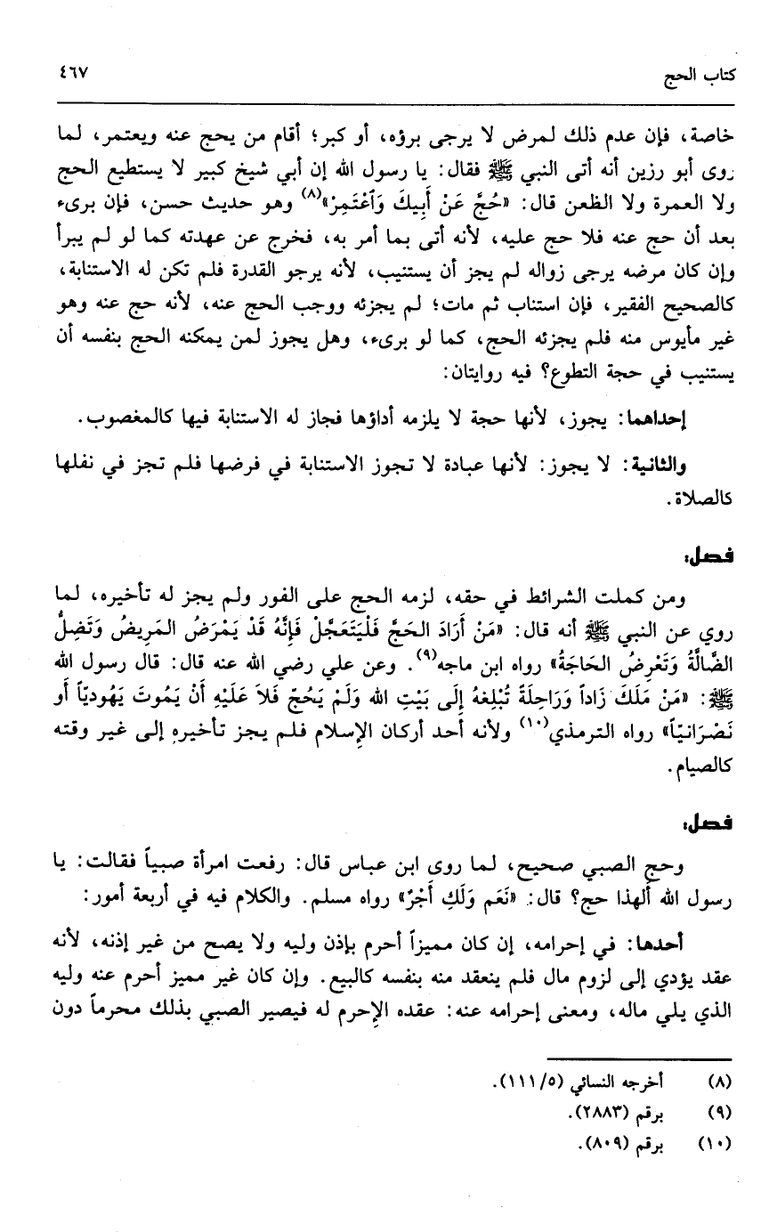 خاصة، فإن عدم ذلك لمرض لا يرجى برؤه، أو كبر، أقام من يحج عنه ويعتمر؛ لما روى أبو رزين أنه أتى النبي - صَلَّى اللَّهُ عَلَيْهِ وَسَلَّمَ - فقال: «يا رسول الله إن أبي شيخ كبير لا يستطيع الحج ولا العمرة ولا الظعن، قال: حج عن أبيك واعتمر» وهو حديث حسن، فإن برئ بعد أن حج عنه فلا حج عليه؛ لأنه أتى بما أمر به، فخرج عن عهدته كما لو لم يبرأ. وإن كان مرضه يرجى زواله لم يجز أن يستنيب؛ لأنه يرجو القدرة فلم تكن له الاستنابة، كالصحيح الفقير، فإن استناب ثم مات؛ لم يجزئه ووجب الحج عنه؛ لأنه حج عنه وهو غير مأيوس منه فلم يجزئه الحج، كما لو برئ، وهل يجوز لمن يمكنه الحج بنفسه أن يستنيب في حجة التطوع؟ فيه روايتان: