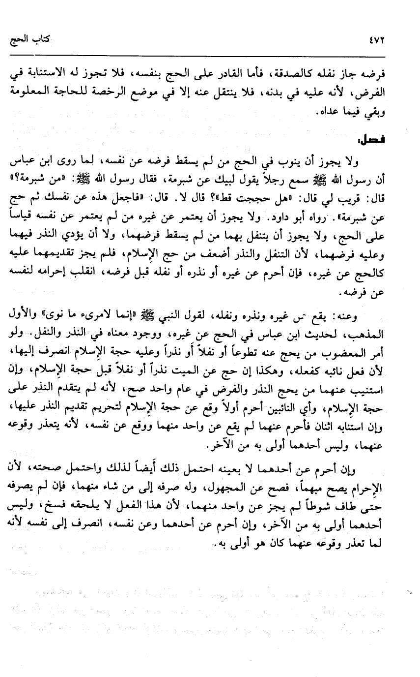 ولا يجوز أن ينوب في الحج من لم يسقط فرضه عن نفسه؛ لما روى ابن عباس «أن رسول الله - صَلَّى اللَّهُ عَلَيْهِ وَسَلَّمَ - سمع رجلاً يقول: لبيك عن شبرمة، فقال رسول الله - صَلَّى اللَّهُ عَلَيْهِ وَسَلَّمَ -: من شبرمة؟ قال: قريب لي، قال: هل حججت قط؟ قال: لا، قال: فاجعل هذه عن نفسك ثم حج عن شبرمة» . رواه أبو داود. ولا يجوز أن يعتمر عن غيره من لم يعتمر عن نفسه قياساً على الحج، ولا يجوز أن يتنفل بهما من لم يسقط فرضهما، ولا أن يؤدي النذر فيهما وعليه فرضهما؛ لأن التنفل والنذر أضعف من حج الإسلام، فلم يجز تقديمهما عليه كالحج عن غيره، فإن أحرم عن غيره أو نذره أو نفله قبل فرضه، انقلب إحرامه لنفسه عن فرضه.