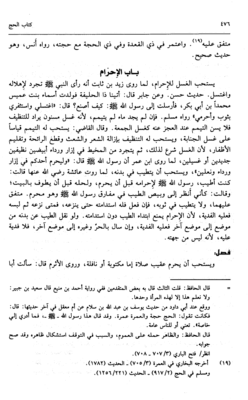 يستحب الغسل للإحرام؛ لما «روى زيد بن ثابت أنه رأى النبي - صَلَّى اللَّهُ عَلَيْهِ وَسَلَّمَ - تجرد لإهلاله واغتسل.» حديث حسن. وعن جابر قال: «أتينا ذا الحليفة فولدت أسماء بنت عميس محمد بن أبي بكر، فأرسلت إلى رسول الله - صَلَّى اللَّهُ عَلَيْهِ وَسَلَّمَ -: كيف أصنع؟ قال: اغتسلي واستثفري بثوب وأحرمي» رواه مسلم. فإن لم يجد ماء لم يتيمم؛ لأنه غسل مسنون يراد للتنظيف فلا يسن التيمم عند العجز عنه كغسل الجمعة. وقال القاضي: يستحب له التيمم قياساً على غسل الجنابة، ويستحب له التنظيف بإزالة الشعر والشعث وقطع الرائحة وتقليم الأظفار؛ لأن الغسل شرع لذلك، ثم يتجرد من المخيط في إزار ورداء أبيضين نظيفين جديدين أو غسيلين؛ لما روى ابن عمر أن رسول الله - صَلَّى اللَّهُ عَلَيْهِ وَسَلَّمَ - قال: «وليحرم أحدكم في إزار ورداء ونعلين» ، ويستحب أن يتطيب في بدنه؛ لما «روت عائشة - رَضِيَ اللَّهُ عَنْهَا - قالت: كنت أطيب، رسول الله - صَلَّى اللَّهُ عَلَيْهِ وَسَلَّمَ - لإحرامه قبل أن يحرم، ولحله قبل أن يطوف بالبيت» ، وقالت: «كأني أنظر إلى وبيص الطيب في مفارق رسول الله - صَلَّى اللَّهُ عَلَيْهِ وَسَلَّمَ - وهو محرم.» متفق عليهما، ولا يتطيب في ثوبه، فإن فعل فله استدامته حتى ينزعه، فمتى نزعه ثم لبسه فعليه الفدية؛ لأن الإحرام يمنع ابتداء الطيب دون استدامته. ولو نقل الطيب عن بدنه من موضع إلى موضع آخر فعليه الفدية، وإن سال بالحر وغيره إلى موضع آخر، فلا فدية عليه؛ لأنه ليس من جهته.