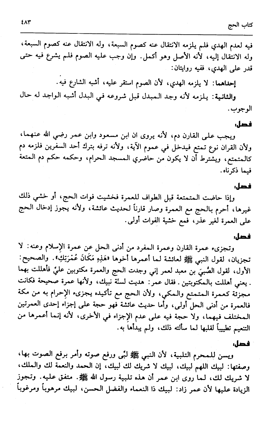 ويسن للمحرم التلبية؛ لأن النبي - صَلَّى اللَّهُ عَلَيْهِ وَسَلَّمَ - لبى ورفع صوته وأمر برفع الصوت بها، وصفتها: لبيك اللهم لبيك؛ لبيك لا شريك لك لبيك، إن الحمد والنعمة لك والملك؛ لا شريك لك؛ لما روى ابن عمر أن هذه تلبية رسول الله - صَلَّى اللَّهُ عَلَيْهِ وَسَلَّمَ -. متفق عليه. وتجوز الزيادة عليها لأن عمر زاد: لبيك ذا النعماء والفضل الحسن؛ لبيك مرهوباً ومرغوباً