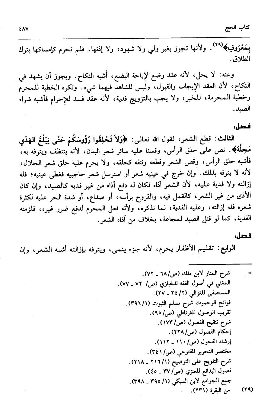 الثالث: قطع الشعر؛ لقول الله تعالى: {وَلا تَحْلِقُوا رُءُوسَكُمْ حَتَّى يَبْلُغَ الْهَدْيُ مَحِلَّهُ} [البقرة: 196] . نص على حلق الرأس، وقسنا عليه سائر شعر البدن؛ لأنه يتنظف ويترفه به، فأشبه حلق الرأس، وقص الشعر وقطعه ونتفه كحلقه، ولا يحرم عليه حلق شعر الحلال؛ لأنه لا يترفه بذلك. وإن خرج في عينه شعر أو استرسل شعر حاجبيه فغطى عينيه، فله إزالته ولا فدية عليه؛ لأن الشعر آذاه فكان له دفع أذاه من غير فدية كالصيد، وإن كان الأذى من غير الشعر، كالقمل فيه، والقروح برأسه، أو صداع، أو شدة الحر عليه لكثرة شعره فله إزالته، وعليه الفدية؛ لما نذكره، ولأنه فعل المحرم لدفع ضرر غيره، فلزمته الفدية، كما لو قتل الصيد لمجاعة، بخلاف من آذاه الشعر.