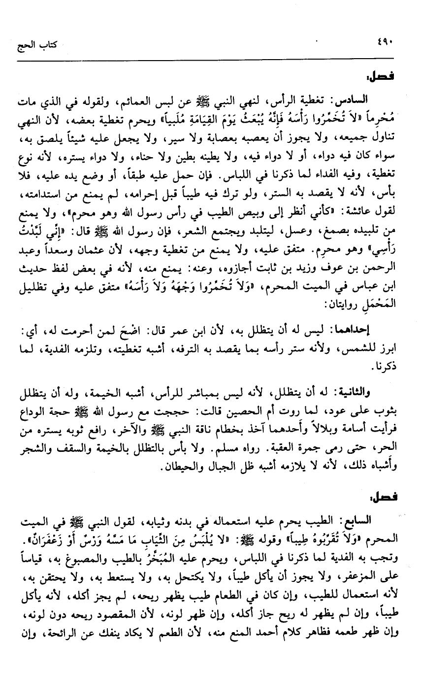 السادس: تغطية الرأس؛ لنهي النبي - صَلَّى اللَّهُ عَلَيْهِ وَسَلَّمَ - عن لبس العمائم، ولقوله في الذي مات محرماً «لا تخمروا رأسه فإنه يبعث يوم القيامة ملبياً» ويحرم تغطية بعضه؛ لأن النهي تناول جميعه، ولا يجوز أن يعصبه بعصابة ولا سير، ولا يجعل عليه شيئاً يلصق به، سواء كان فيه دواء، أو لا دواء فيه، ولا يطينه بطين ولا حناء، ولا دواء يستره؛ لأنه نوع تغطية، وفيه الفداء لما ذكرنا في اللباس. فإن حمل عليه طبقاً، أو وضع يده عليه، فلا بأس؛ لأنه لا يقصد به الستر، ولو ترك فيه طيباً قبل إحرامه؛ لم يمنع من استدامته؛ لقول عائشة: «كأني أنظر إلى وبيص الطيب في رأس رسول الله وهو محرم» ، ولا يمنع من تلبيده بصمغ، وعسل؛ ليتلبد ويجتمع الشعر، فإن رسول الله - صَلَّى اللَّهُ عَلَيْهِ وَسَلَّمَ - قال: «إني لبدت رأسي» وهو محرم. متفق عليه، ولا يمنع من تغطية وجهه؛ لأن عثمان وسعداً وعبد الرحمن بن عوف وزيد بن ثابت أجازوه، وعنه: يمنع منه؛ لأنه في بعض لفظ حديث ابن عباس في الميت المحرم، «ولا تخمروا وجهه ولا رأسه» متفق عليه وفي تظليل المحمل روايتان: