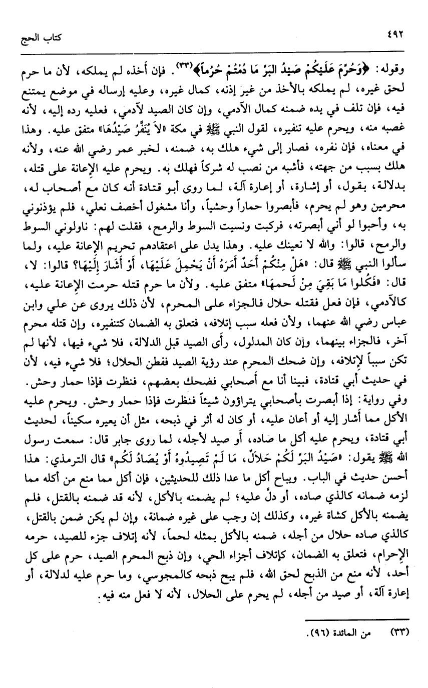وفي رواية: «إذ أبصرت بأصحابي يتراؤون شيئاً فنظرت فإذا حمار وحش» ، ويحرم عليه الأكل مما أشار عليه أو أعان عليه، أو كان له أثر في ذبحه، مثل أن يعيره سكيناً؛ لحديث أبي قتادة، ويحرم عليه أكل ما صاده، أو صيد لأجله؛ لما روى جابر قال: سمعت رسول الله - صَلَّى اللَّهُ عَلَيْهِ وَسَلَّمَ - يقول: «صيد البر لكم حلال، ما لم تصيدوه أو يصاد لكم» قال الترمذي: هذا أحسن حديث في الباب. ويباح أكل ما عدا ذلك للحديثين، فإن أكل مما منع من أكله مما لزمه ضمانه كالذي صاده، أو دل عليه؛ لم يضمنه بالأكل لأنه قد ضمنه بالقتل، فلم يضمنه بالأكل كشاة غيره، وكذلك إن وجب على غيره ضمانة، وإن لم يكن ضمن بالقتل، كالذي صاده حلال من أجله، ضمنه بالأكل بمثله لحماً؛ لأنه إتلاف جزء للصيد، حرمه الإحرام، فتعلق به الضمان، كإتلاف أجزاء الحي، وإن ذبح المحرم الصيد، حرم على كل أحد؛ لأنه منع من الذبح لحق الله، فلم يبح ذبحه كالمجوسي، وما حرم عليه لدلالة، أو إعارة آلة، أو صيد من أجله؛ لم يحرم على الحلال؛ لأن لا فعل منه فيه.