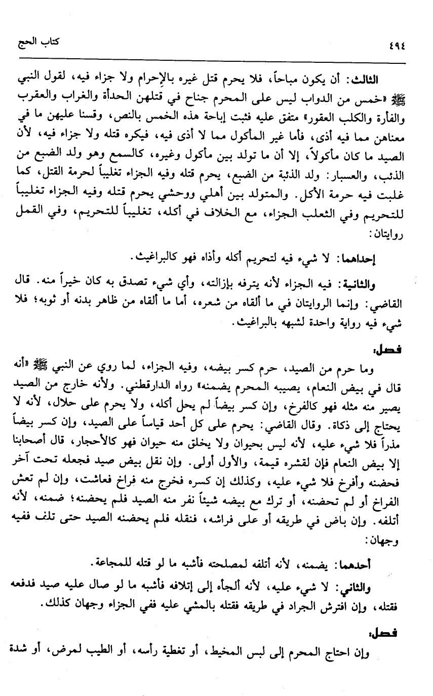 الثالث: أن يكون مباحاً، فلا يحرم قتل غيره بالإحرام ولا جزاء فيه؛ لقول النبي - صَلَّى اللَّهُ عَلَيْهِ وَسَلَّمَ -: «خمس من الدواب ليس على المحرم جناح في قتلهن: الحدأة والغراب والعقرب والفأرة والكلب العقور» متفق عليه. فثبت إباحة هذه الخمس بالنص، وقسنا عليهن ما في معناهن مما فيه أذى، فأما غير المأكول مما لا أذى فيه، فيكره قتله ولا جزاء فيه؛ لأن الصيد ما كان مأكولاً، إلا أن ما تولد بين مأكول وغيره، كالسمع وهو ولد الضبع من الذئب، والعسبار: ولد الذئبة من الضبع، يحرم قتله وفيه الجزاء تغليباً لحرمة القتل، كما غلبت فيه حرمة الأكل. والمتولد بين أهلي ووحشي يحرم قتله وفيه الجزاء تغليباً للتحريم، وفي الثعلب الجزاء، مع الخلاف في أكله، تغليباً للتحريم، وفي القمل روايتان: