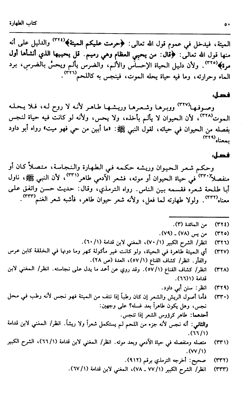 وصوفها ووبرها وشعرها وريشها طاهر لأنه لا روح له، فلا يحله الموت؛ لأن الحيوان لا يألم بأخذه، ولا يحس، ولأنه لو كانت فيه حياة لنجس بفصله من الحيوان في حياته، لقول النبي - صَلَّى اللَّهُ عَلَيْهِ وَسَلَّمَ -: «ما أبين من حي فهو ميت» رواه أبو داود بمعناه.