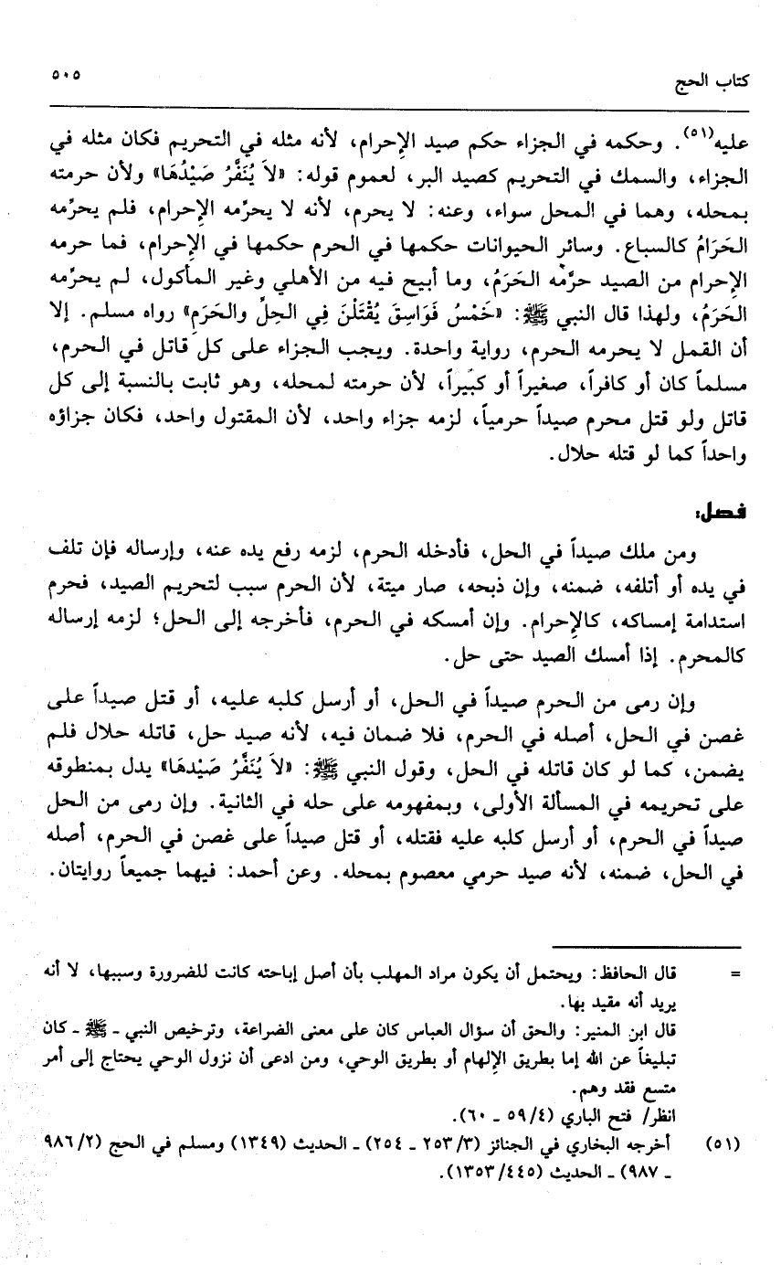 عليه. وحكمه في الجزاء حكم صيد الإحرام؛ لأنه مثله في التحريم فكان مثله في الجزاء، والسمك في التحريم كصيد البر؛ لعموم قوله: «لا ينفر صيدها» ولأن حرمته بمحله، وهما في المحل سواء، وعنه: لا يحرم؛ لأنه لا يحرمه الإحرام، فلم يحرمه الحرم كالسباع. وسائر الحيوانات حكمها في الحرم حكمها في الإحرام، فما حرمه الإحرام من الصيد حرمه الحرم، وما أبيح فيه من الأهلي وغير المأكول؛ لم يحرمه الحرم، ولهذا قال النبي - صَلَّى اللَّهُ عَلَيْهِ وَسَلَّمَ -: «خمس فواسق يقتلن في الحل والحرم» رواه مسلم. إلا أن القمل لا يحرمه الحرم، رواية واحدة. ويجب الجزاء على كل قاتل في الحرام، مسلماً كان أو كافراً، صغيراً أو كبيراً؛ لأن حرمته لمحله، وهو ثابت بالنسبة إلى كل قاتل، ولو قتل محرم صيداً حرمياً؛ لزمه جزاء واحد؛ لأن المقتول واحد، فكان جزاؤه واحداً كما لو قتله حلال.