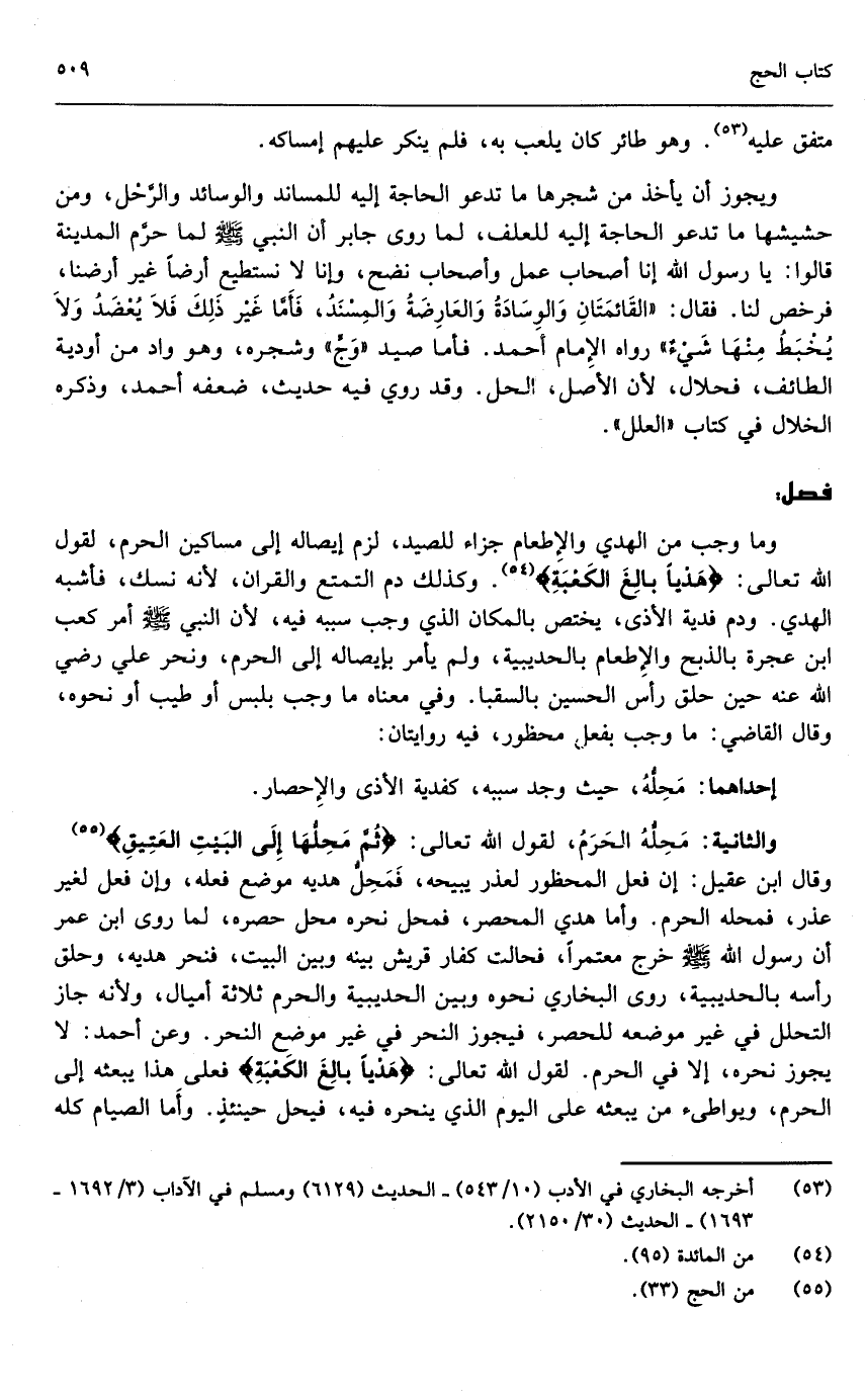 والثانية: محله الحرم؛ لقول الله تعالى: {ثُمَّ مَحِلُّهَا إِلَى الْبَيْتِ الْعَتِيقِ} [الحج: 33] وقال ابن عقيل: إن فعل المحظور لعذر يبيحه، فحمل هديه موضع فعله، وإن فعل لغير عذر، فمحله الحرم. وأما هدي المحصر، فمحل نحره محل حصره؛ لما روى ابن عمر «أن رسول الله - صَلَّى اللَّهُ عَلَيْهِ وَسَلَّمَ - خرج معتمراً، فحالت كفار قريش بينه وبين البيت، فنحر هديه، وحلق رأسه بالحديبية» ، روى البخاري نحوه، وبين الحديبية والحرم ثلاثة أميال، ولأنه جاز التحلل في غير موضعه للحصر، فيجوز النحر في غير موضع النحر، وعن أحمد: لا يجوز نحره إلا في الحرم. لقول الله تعالى: {هَدْيًا بَالِغَ الْكَعْبَةِ} [المائدة: 95] فعلى هذا يبعثه إلى الحرم، ويواطئ من يبعثه على اليوم الذي ينحره فيه، فيحل حينئذ. وأما الصيام كله