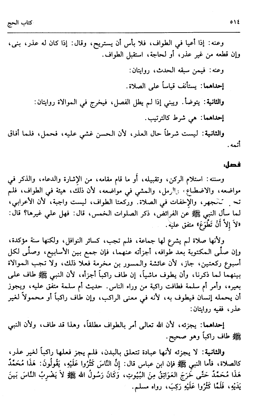 والثانية: لا يجزئه لأنها عبادة تتعلق بالبدن، فلم يجز فعلها راكباً لغير عذر، كالصلاة، فأما النبي - صَلَّى اللَّهُ عَلَيْهِ وَسَلَّمَ - فإن ابن عباس قال: «إن الناس كثروا عليه، يقولون: هذا محمد هذا محمد، حتى خرج العواتق من البيوت، وكان رسول الله - صَلَّى اللَّهُ عَلَيْهِ وَسَلَّمَ - لا يضرب الناس بين يديه فلما كثروا عليه ركب» ، رواه مسلم.