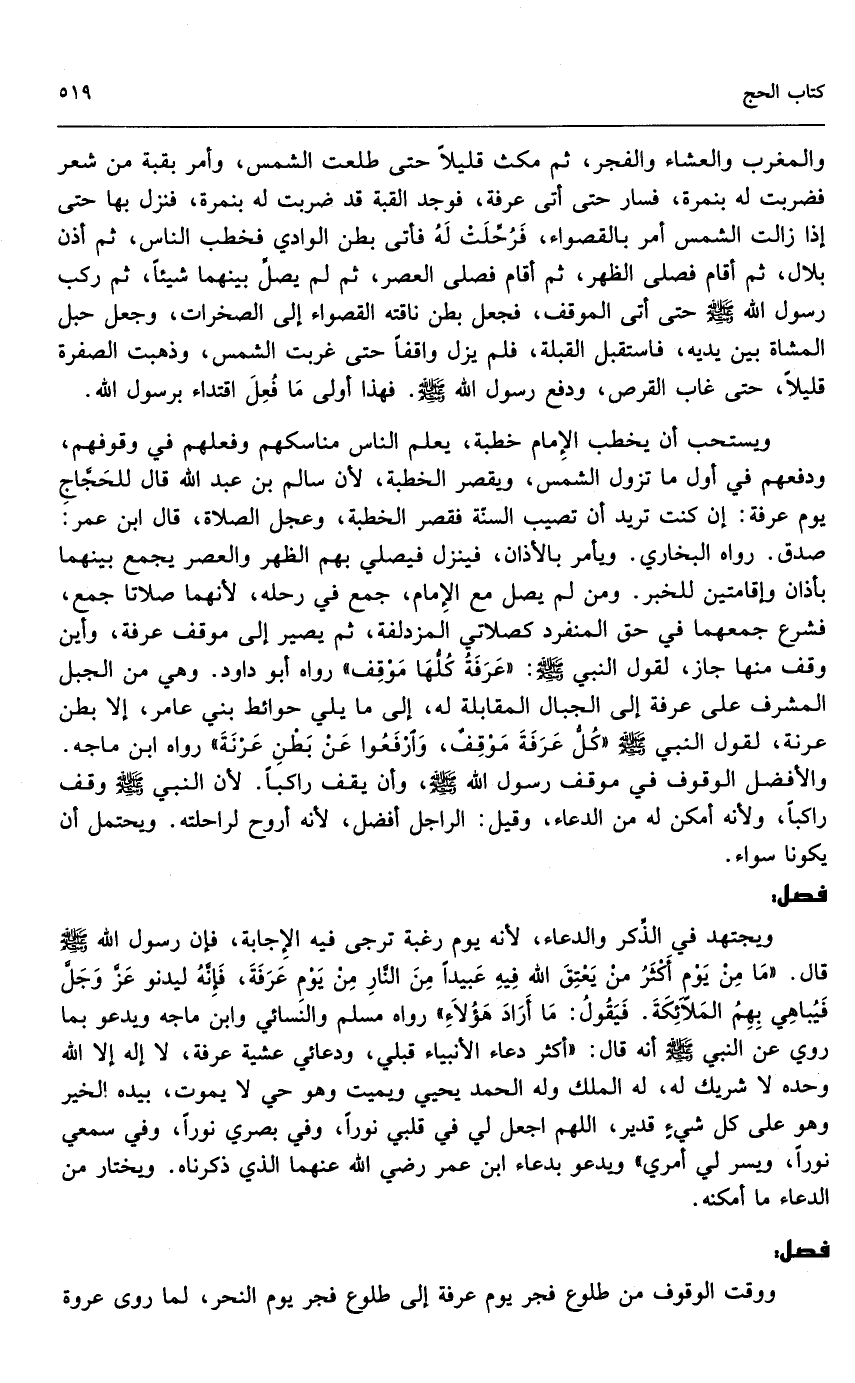 والمغرب والعشاء والفجر، ثم مكث قليلاً حتى طلعت الشمس، وأمر بقبة من شعر فضُربت له بنمرة، فسار حتى أتى عرفة، فوجد القبة قد ضربت له بنمرة، فنزل بها حتى إذا زالت الشمس أمر بالقصواء، فرحلت له فأتى بطن الوادي فخطب الناس، ثم أذن بلال، ثم أقام فصلى الظهر، ثم أقام فصلى العصر، ثم لم يصل بينهما شيئاً، ثم ركب رسول الله - صَلَّى اللَّهُ عَلَيْهِ وَسَلَّمَ - حتى أتى الموقف، فجعل بطن ناقته القصواء إلى الصخرات وجعل حبل المشاة بين يديه، فاستقبل القبلة، فلم يزل واقفاً حتى غربت الشمس، وذهبت الصفرة قليلاً، حتى غاب القرص، ودفع رسول الله - صَلَّى اللَّهُ عَلَيْهِ وَسَلَّمَ -؛ فهذا أولى ما فعل اقتداء برسول الله - صَلَّى اللَّهُ عَلَيْهِ وَسَلَّمَ -» .