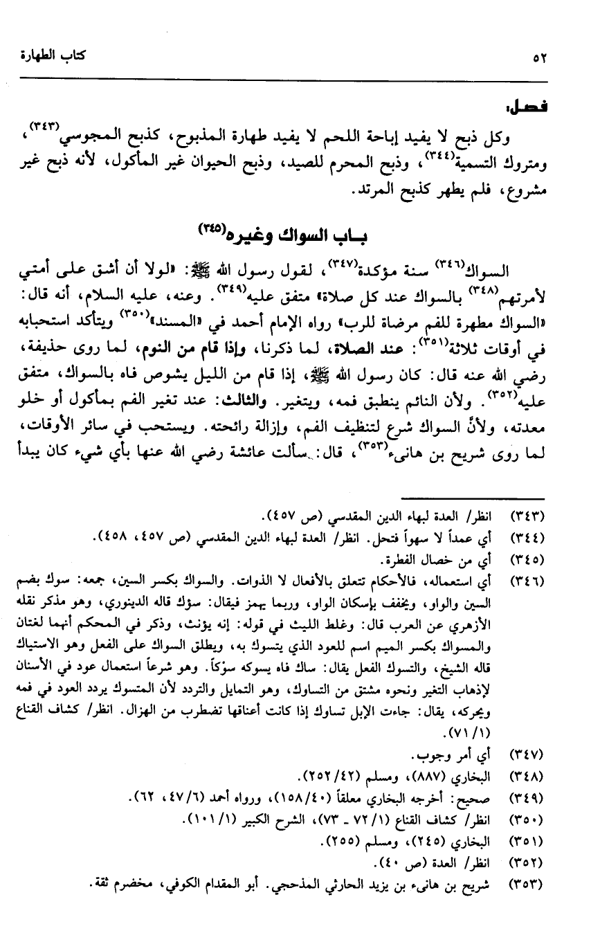 السواك سنة مؤكدة، لقول رسول الله - صَلَّى اللَّهُ عَلَيْهِ وَسَلَّمَ -: «لولا أن أشق على أمتي لأمرتهم بالسواك عند كل صلاة» متفق عليه. وعنه - عَلَيْهِ السَّلَامُ -، أنه قال: «السواك مطهرة للفم مرضاة للرب» رواه الإمام أحمد في المسند، ويتأكد استحبابه في أوقات ثلاثة: عند الصلاة؛ لما ذكرنا، وإذا قام من النوم؛ لما روى حذيفة - رَضِيَ اللَّهُ عَنْهُ - قال: «كان رسول الله - صَلَّى اللَّهُ عَلَيْهِ وَسَلَّمَ - إذا قام من الليل يشوص فاه بالسواك» ، متفق عليه. ولأن النائم ينطبق فمه ويتغير. والثالث: عند تغير الفم بمأكول أو خلو معدته، ولأن السواك شرع لتنظيف الفم، وإزالة رائحته. ويستحب في سائر الأوقات؛ لما روى شريح بن هانئ، قال: «سألت عائشة - رَضِيَ اللَّهُ عَنْهَا - بأي شيء كان يبدأ