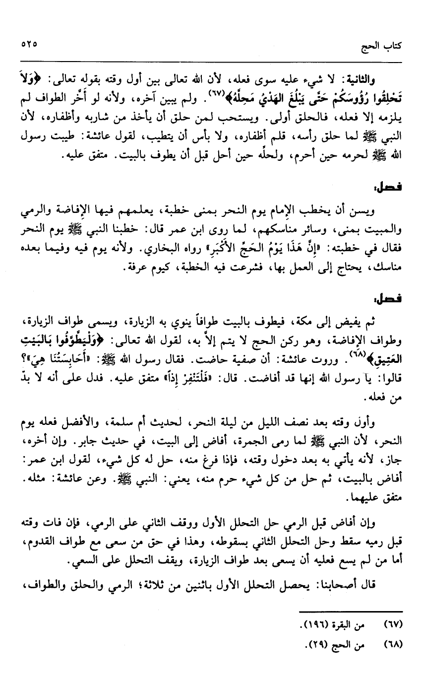 ثم يفيض إلى مكة، فيطوف بالبيت طوافاً ينوي به الزيارة، ويسمى طواف الزيارة، وطواف الإفاضة، وهو ركن الحج لا يتم إلا به؛ لقول الله تعالى: {وَلْيَطَّوَّفُوا بِالْبَيْتِ الْعَتِيقِ} [الحج: 29] . وروت عائشة: «أن صفية حاضت. فقال رسول الله - صَلَّى اللَّهُ عَلَيْهِ وَسَلَّمَ -: أحابستنا هي؟ قالوا: يا رسول الله إنها قد أفاضت. قال: فلتنفر إذا» متفق عليه. فدل على أنه لا بد من فعله.
