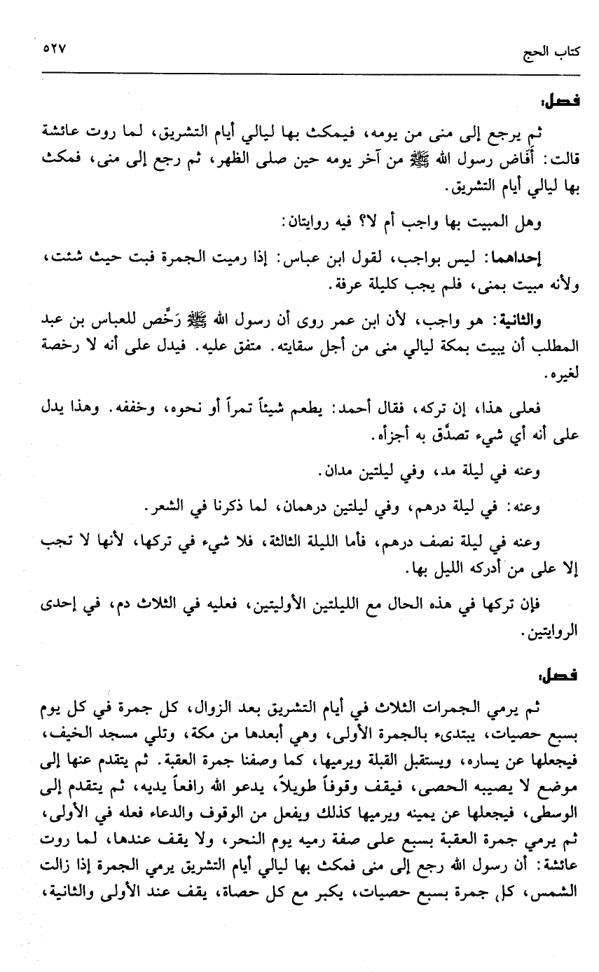 ثم يرمي الجمرات الثلاث في أيام التشريق بعد الزوال، كل جمرة في كل يوم بسبع حصيات، يبتدئ بالجمرة الأولى، وهي أبعدها من مكة، وتلي مسجد الخيف، فيجعلها عن يساره، ويستقبل القبلة ويرميها، كما وصفنا جمرة العقبة. ثم يتقدم عنها إلى موضع لا يصيبه الحصى، فيقف وقوفاً طويلاً، يدعو الله رافعاً يديه، ثم يتقدم إلى الوسطى، فيجعلها عن يمينه ويرميها كذلك ويفعل من الوقوف والدعاء فعله في الأولى، ثم يرمي جمرة العقبة بسبع على صفة رميه يوم النحر، ولا يقف عندها، لما روت عائشة، «أن رسول الله - صَلَّى اللَّهُ عَلَيْهِ وَسَلَّمَ - رجع إلى منى فمكث بها ليالي أيام التشريق يرمي الجمرات إذا زالت الشمس، كل جمرة بسبع حصيات، يكبر مع كل حصاة، يقف عند الأولى والثانية،