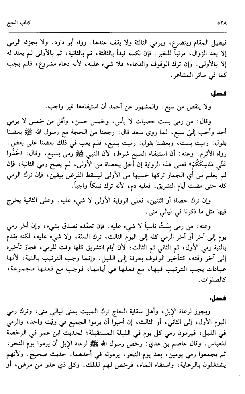 ويجوز لرعاة الإبل، وأهل سقاية الحاج ترك المبيت بمنى ليالي منى، وترك رمي اليوم الأول، إلى الثاني، أو الثالث، إن أحبوا أن يرموا الجميع في وقت واحد، والرمي في الليل، فيرمون رمي كل يوم في الليلة المستقبلة، لحديث ابن عمر في الرخصة للعباس. وقال عاصم بن عدي: «رخص رسول الله - صَلَّى اللَّهُ عَلَيْهِ وَسَلَّمَ - لرعاة الإبل أن يرموا يوم النحر، ثم يجمعوا رمي يومين، بعد يوم النحر، يرمونه في أحدهما» . حديث صحيح. ولأنهم يشتغلون بالرعاية، واستقاء الماء، فرخص لهم ذلك. وكل ذي عذر من مرض، أو