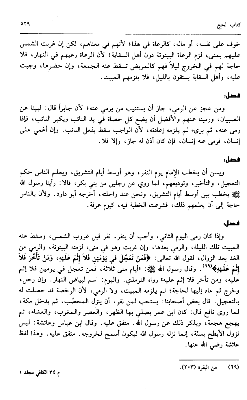 وإذا كان رمي اليوم الثاني، وأحب أن ينفر، نفر قبل غروب الشمس، وسقط عنه المبيت تلك الليلة، والرمي بعدها، وإن غربت وهو في منى، لزمته البيتوتة، والرمي من الغد بعد الزوال؛ لقول الله تعالى: {فَمَنْ تَعَجَّلَ فِي يَوْمَيْنِ فَلا إِثْمَ عَلَيْهِ وَمَنْ تَأَخَّرَ فَلا إِثْمَ عَلَيْهِ} [البقرة: 203] . وقال رسول الله - صَلَّى اللَّهُ عَلَيْهِ وَسَلَّمَ -: «أيام منى ثلاثة، فمن تعجل في يومين فلا إثم عليه، ومن تأخر فلا إثم عليه» رواه الترمذي. واليوم: اسم لبياض النهار. وإن رحل، وخرج ثم عاد إليها لحاجة، فلم يلزمه المبيت، ولا الرمي؛ لأن الرخصة قد حصلت له بالتعجيل. قال بعض أصحابنا: يستحب لمن نفر أن ينزل المحصب، ثم يدخل مكة، لما روى نافع قال: «كان ابن عمر يصلي بها الظهر، والعصر والمغرب، والعشاء، ثم يهجع هجعة، ويذكر ذلك عن رسول الله - صَلَّى اللَّهُ عَلَيْهِ وَسَلَّمَ -» . متفق عليه. وقال ابن عباس وعائشة: «ليس نزول الأبطح بسنة، إنما نزله رسول الله - صَلَّى اللَّهُ عَلَيْهِ وَسَلَّمَ - ليكون أسمح لخروجه» . متفق عليه. وهذا لفظ عائشة - رَضِيَ اللَّهُ عَنْهَا -.