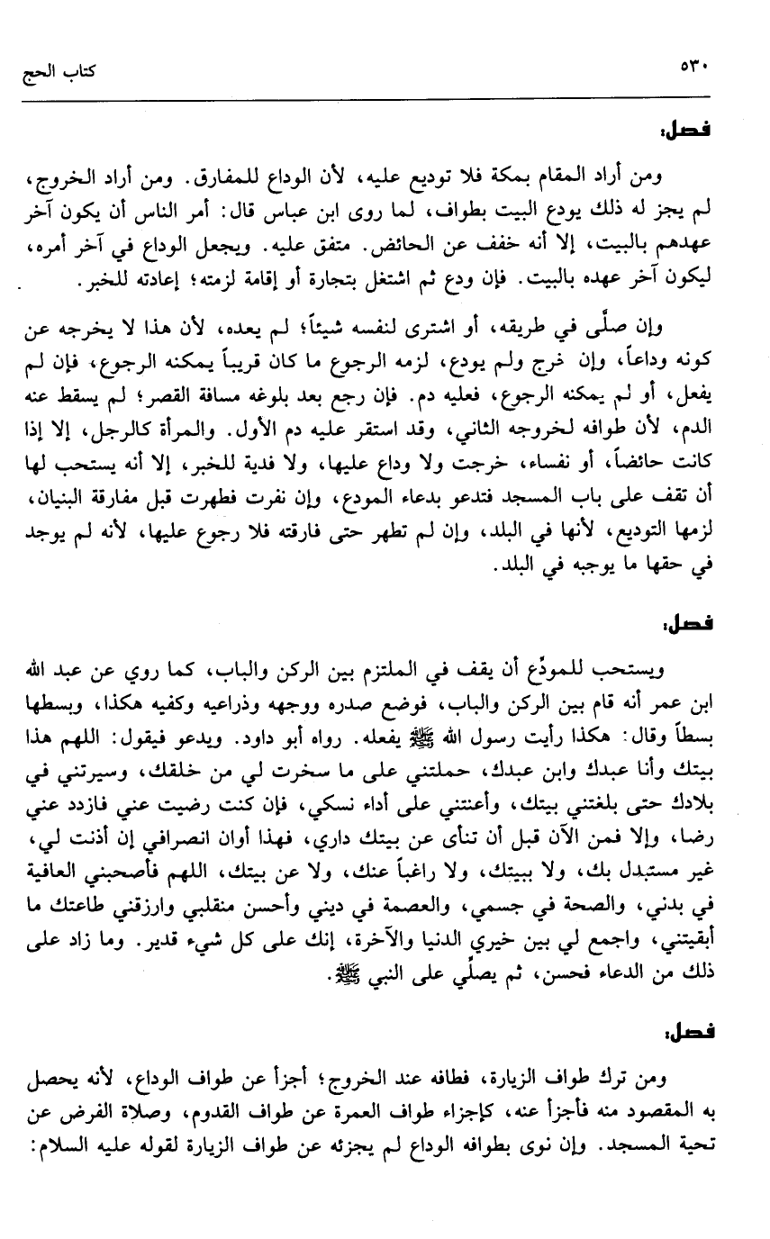 ويستحب للمودع أن يقف في الملتزم بين الركن والباب، كما روي «عن عبد الله بن عمر أنه قام بين الركن والباب، فوضع صدره ووجهه وذراعيه وكفيه هكذا، وبسطها بسطاً وقال: هكذا رأيت رسول الله - صَلَّى اللَّهُ عَلَيْهِ وَسَلَّمَ - يفعله» . رواه أبو داود. ويدعو فيقول: اللهم هذا بيتك وأنا عبدك وابن عبدك، حملتني على ما سخرت لي من خلقك، وسيرتني في بلادك حتى بلغتني بيتك، وأعنتني على أداء نسكي، فإن كنت رضيت عني فازدد عني رضاً، وإلا فمن الآن قبل أن تنأى عن بيتك داري، فهذا أوان انصرافي إن أذنت لي، غير مستبدل بك، ولا ببيتك، ولا راغباً عنك، ولا عن بيتك، اللهم فأصحبني العافية في بدني، والصحة في جسمي، والعصمة في ديني، وأحسن منقلبي، وارزقني طاعتك ما أبقيتني، واجمع لي بين خيري الدنيا والآخرة، إنك على كل شيء قدير. وما زاد على ذلك من الدعاء فحسن، ثم يصلي على النبي - صَلَّى اللَّهُ عَلَيْهِ وَسَلَّمَ -.