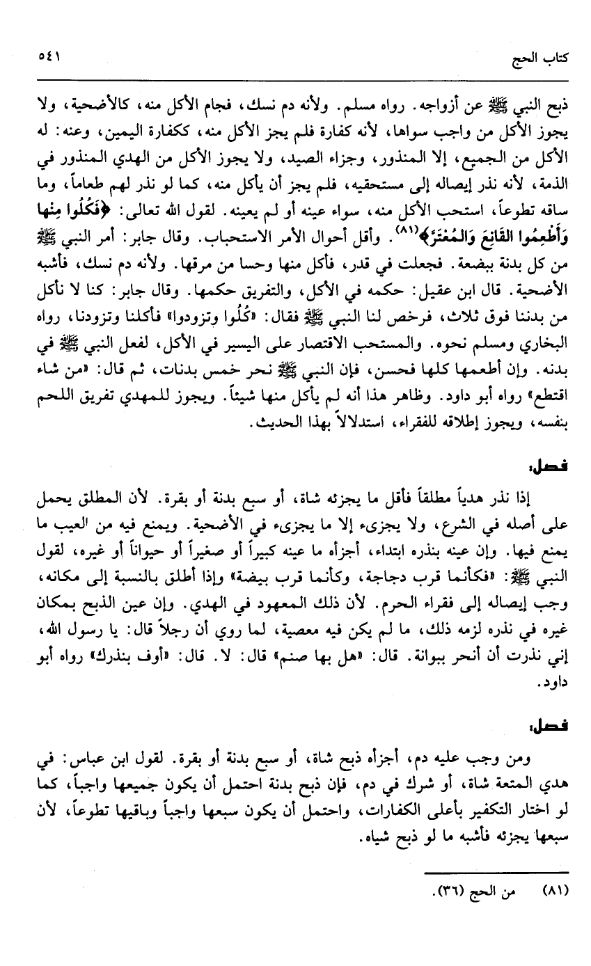 ذبح النبي - صَلَّى اللَّهُ عَلَيْهِ وَسَلَّمَ - عن أزواجه» . رواه مسلم. ولأنه دم نسك فجاز الأكل منه كالأضحية، ولا يجوز الأكل من واجب سواها؛ لأنه كفارة فلم يجز الأكل منه، ككفارة اليمين، وعنه: له الأكل من الجميع، إلا المنذور، وجزاء الصيد، ولا يجوز الأكل من الهدي المنذور في الذمة؛ لأنه نذر إيصاله إلى مستحقيه، فلم يجز أن يأكل منه، كما لو نذر لهم طعاماً، وما ساقه تطوعاً استحب الأكل منه، سواء عينه أو لم يعينه. لقول الله تعالى: {فَكُلُوا مِنْهَا وَأَطْعِمُوا الْقَانِعَ وَالْمُعْتَرَّ} [الحج: 36] . وأقل أحوال الأمر الاستحباب. وقال جابر: «أمر النبي - صَلَّى اللَّهُ عَلَيْهِ وَسَلَّمَ - من كل بدنة ببضعة. فجعلت في قدر، فأكل منها وحسا من مرقها» . ولأنه دم نسك فأشبه الأضحية. قال ابن عقيل: حكمه في الأكل، والتفريق حكمها. وقال جابر: «كنا لا نأكل من بدننا فوق ثلاث، فرخص لنا النبي - صَلَّى اللَّهُ عَلَيْهِ وَسَلَّمَ - فقال: كلوا وتزودوا فأكلنا وتزودنا» ، رواه البخاري ومسلم ونحوه. والمستحب الاقتصار على اليسير في الأكل، لفعل النبي - صَلَّى اللَّهُ عَلَيْهِ وَسَلَّمَ - في بدنه. وإن أطعمها كلها فحسن، فإن النبي - صَلَّى اللَّهُ عَلَيْهِ وَسَلَّمَ - نحر خمس بدنات، ثم قال: «من شاء اقتطع» رواه أبو داود. وظاهر هذا أنه لم يأكل منها شيئاً، ويجوز للمهدي تفريق اللحم بنفسه، ويجوز إطلاقه للفقراء، استدلالاً بهذا الحديث.