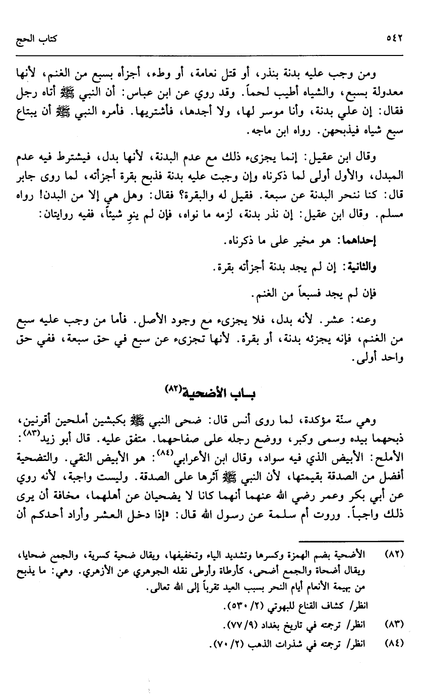 وهي سنة مؤكدة، لما روى أنس قال: «ضحى النبي - صَلَّى اللَّهُ عَلَيْهِ وَسَلَّمَ - بكبشين أملحين أقرنين، ذبحهما بيده وسمى وكبر، ووضع رجله على صفاحهما» . متفق عليه. قال أبو زيد: الأملح: الأبيض الذي فيه سواد، وقال ابن الأعرابي: هو الأبيض النقي. والتضحية أفضل من الصدقة بقيمتهما؛ لأن النبي - صَلَّى اللَّهُ عَلَيْهِ وَسَلَّمَ - آثرها على الصدقة. وليست واجبة؛ لأنه روي عن أبي بكر وعمر - رَضِيَ اللَّهُ عَنْهُمَا - أنهما كانا لا يضحيان عن أهلهما مخافة أن يرى ذلك واجباً. وروت أم سلمة عن رسول الله قال: «إذا دخل العشر وأراد أحدكم أن