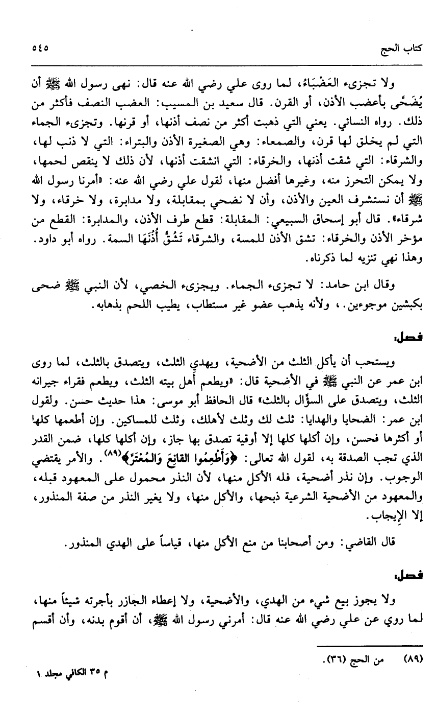 ولا تجزئ العضباء، لما روى علي - رَضِيَ اللَّهُ عَنْهُ - قال: «نهى رسول الله - صَلَّى اللَّهُ عَلَيْهِ وَسَلَّمَ - أن يضحى بأعضب الأذن، أو القرن» . قال سعيد بن المسيب: العضب النصف فأكثر من ذلك. رواه النسائي. يعني التي ذهب أكثر من نصف أذنها، أو قرنها، وتجزئ الجماء التي لم يخلق لها قرن، والصمعاء: وهي الصغيرة الأذن والبتراء: التي لا ذنب لها، والشرقاء: التي شقت أذنها، والخرقاء: التي انشقت أذنها؛ لأن ذلك لا ينقص لحمها، ولا يمكن التحرز منه، وغيرها أفضل منها؛ لقول علي - رَضِيَ اللَّهُ عَنْهُ -: «أمرنا رسول الله - صَلَّى اللَّهُ عَلَيْهِ وَسَلَّمَ - أن نستشرف العين والأذن، وأن لا نضحي بمقابلة، ولا مدابرة، ولا خرقاء، ولا شرقاء» . قال أبو إسحاق السبيعي: المقابلة: قطع طرف الأذن، والمدابرة: القطع من مؤخرة الأذن، والخرقاء: تشق الأذن للمسة، والشرقاء: تشق أذنها السمة. رواه أبو داود. وهذا نهي تنزيه لما ذكرنا.