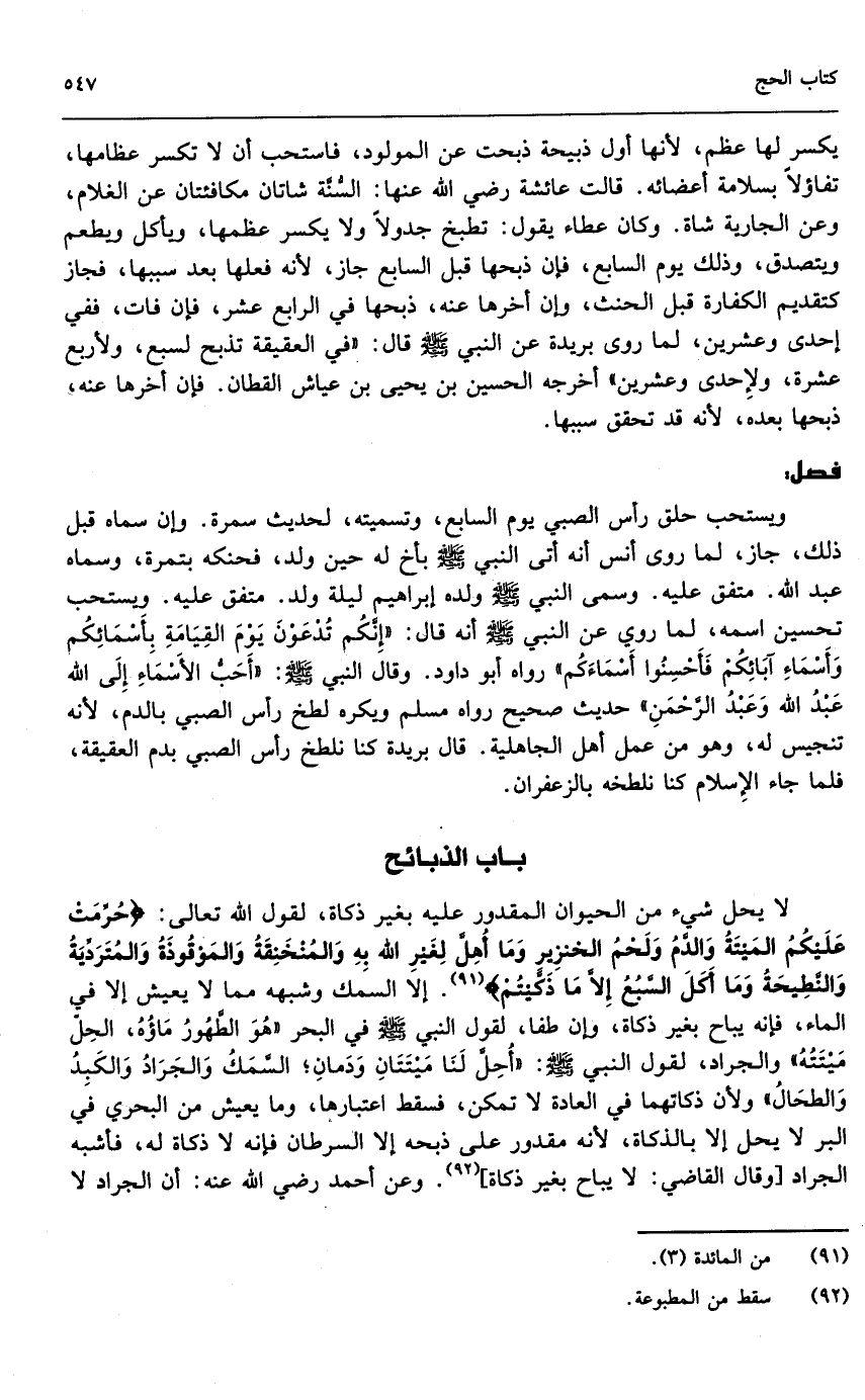 لا يحل شيء من الحيوان المقدور عليه بغير ذكاة؛ لقول الله تعالى: {حُرِّمَتْ عَلَيْكُمُ الْمَيْتَةُ وَالدَّمُ وَلَحْمُ الْخِنْزِيرِ وَمَا أُهِلَّ لِغَيْرِ اللَّهِ بِهِ وَالْمُنْخَنِقَةُ وَالْمَوْقُوذَةُ وَالْمُتَرَدِّيَةُ وَالنَّطِيحَةُ وَمَا أَكَلَ السَّبُعُ إِلا مَا ذَكَّيْتُمْ} [المائدة: 3] . إلا السمك وما شبهه مما لا يعيش إلا في الماء، فإنه يباح بغير ذكاة، وإن طفا؛ لقول النبي - صَلَّى اللَّهُ عَلَيْهِ وَسَلَّمَ - في البحر: «هو الطهور ماؤه، الحل ميتته» والجراد؛ لقول النبي - صَلَّى اللَّهُ عَلَيْهِ وَسَلَّمَ -: «أحل لنا ميتتان ودمان، السمك والجراد والكبد والطحال» ولأن ذكاتهما في العادة لا تمكن، فسقط اعتبارها، وما يعيش من البحري في البر لا يحل إلا بالذكاة؛ لأنه مقدور على ذبحه إلا السرطان فإنه لا ذكاة له، فأشبه الجراد [وقال القاضي: لا يباح بغير ذكاة] . وعن أحمد - رَضِيَ اللَّهُ عَنْهُ -: أن الجراد لا