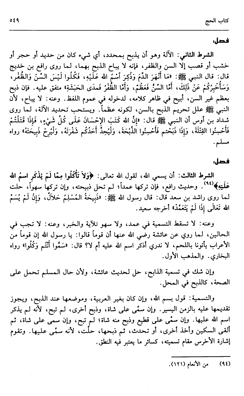 الشرط الثاني: الآلة وهو أن يذبح بمحدد، أي شيء كان من حديد أو حجر أو خشب أو قصب إلا السن والظفر، فإنه لا يباح الذبح بهما، لما روى رافع بن خديج قال: قال النبي - صَلَّى اللَّهُ عَلَيْهِ وَسَلَّمَ -: «ما أنهر الدم وذكر اسم الله عليه فكلوا، ليس السن والظفر، وسأخبركم عن ذلك، أما السن فعظم، وأما الظفر فمدى الحبشة» متفق عليه. فإن ذبح بعظم غير السن، أبيح في ظاهر كلامه، لدخوله في عموم اللفظ. وعنه: لا يباح؛ لأن النبي - صَلَّى اللَّهُ عَلَيْهِ وَسَلَّمَ - علل تحريم الذبح بالسن، لكونه عظماً. ويستحب تحديد الآلة، لما روى شداد بن أوس أن النبي - صَلَّى اللَّهُ عَلَيْهِ وَسَلَّمَ - قال: «إن الله كتب الإحسان على كل شيء، فإذا قتلتم فأحسنوا القتلة، وإذا ذبحتم فأحسنوا الذبحة، وليحد أحدكم شفرته، وليرح ذبيحته» رواه مسلم.