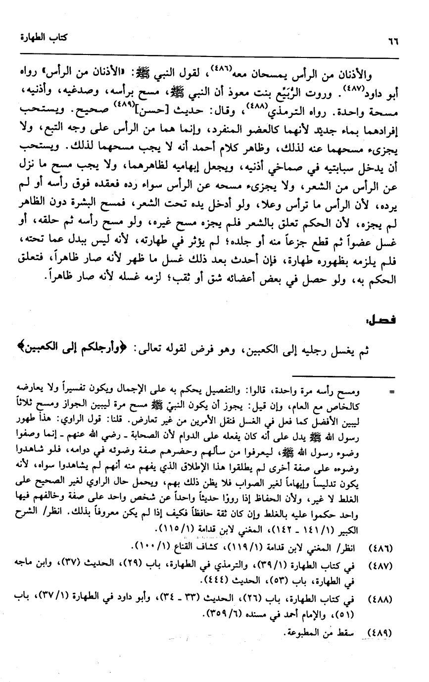 والأذنان في الرأس يمسحان معه، لقول النبي - صَلَّى اللَّهُ عَلَيْهِ وَسَلَّمَ -: «الأذنان من الرأس» رواه أبو داود. وروت الربيع بنت معوذ أن النبي - صَلَّى اللَّهُ عَلَيْهِ وَسَلَّمَ - «مسح برأسه، وصدغيه، وأذنيه، مسحة واحدة» . رواه الترمذي، وقال حديث [حسن] صحيح. ويستحب إفرادهما بماء جديد لأنهما كالعضو المنفرد، وإنما هما من الرأس على وجه التبع، ولا يجزئ مسحهما عنه لذلك، وظاهر كلام أحمد أنه لا يجب مسحهما لذلك، ويستحب أن يدخل سبابتيه في صماخي أذنيه، ويجعل إبهاميه لظاهرهما، ولا يجب مسح ما نزل عن الرأس من الشعر، ولا يجزئ مسحه عن الرأس سواء رده فعقده فوق رأسه أو لم يرده، لأن الرأس ما ترأس وعلا، ولو أدخل يده تحت الشعر، فمسح البشرة دون الظاهر لم يجزه، لأن الحكم تعلق بالشعر فلم يجزه مسح غيره، ولو مسح رأسه ثم حلقه، أو غسل عضوا ثم قطع جزعا منه أو جلده، لم يؤثر في طهارته، لأنه ليس ببدل عما تحته، فلم يلزمه بظهوره طهارة، فإن أحدث بعد ذلك غسل ما ظهر لأنه صار ظاهرا، فتعلق الحكم به، ولو حصل في بعض أعضائه شق أو ثقب، لزمه غسله لأنه صار ظاهرا.
