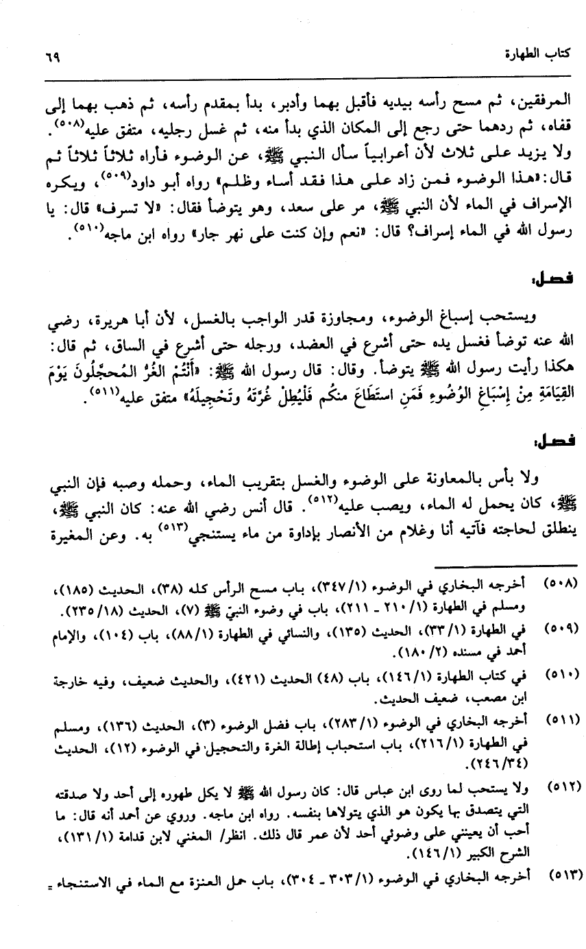 المرفقين، ثم مسح رأسه بيديه فأقبل بهما وأدبر، بدأ بمقدم رأسه، ثم ذهب بهما إلى قفاه، ثم ردهما ثم رجع إلى المكان الذي بدأ منه، ثم غسل رجليه» ، متفق عليه. ولا يزيد على ثلاث لأن «أعرابيا سأل النبي - صَلَّى اللَّهُ عَلَيْهِ وَسَلَّمَ - عن الوضوء، فأراه ثلاثا ثلاثا ثم قال: " هذا الوضوء فمن زاد على هذا فقد أساء وظلم» رواه أبو داود، ويكره الإسراف في الماء لأن «النبي - صَلَّى اللَّهُ عَلَيْهِ وَسَلَّمَ - مر على سعد وهو يتوضأ فقال: " لا تسرف " قال: يا رسول الله: في الماء إسراف؟ قال: " نعم وإن كنت على نهر جار» رواه ابن ماجه.