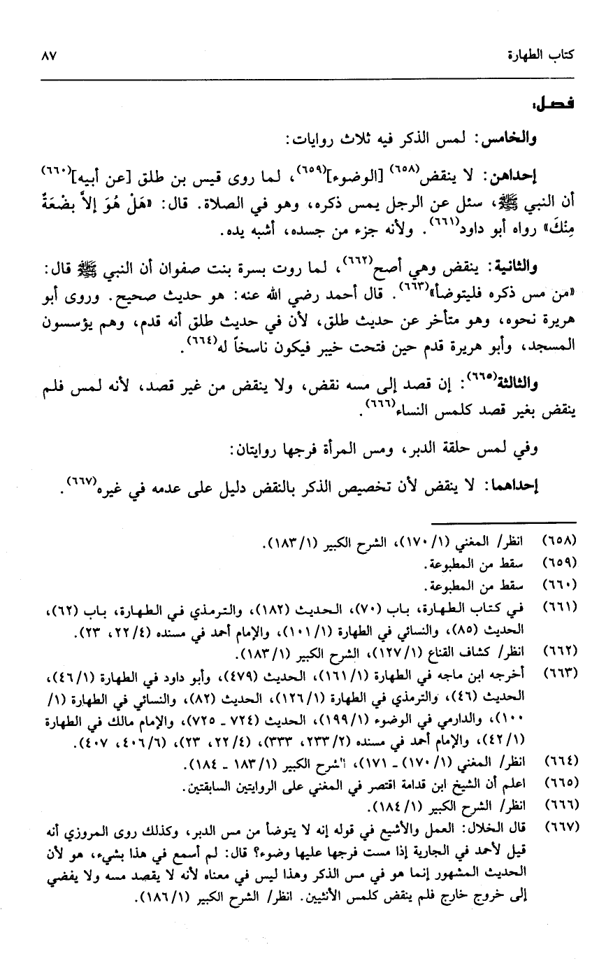 والثانية: ينقض وهي أصح، لما روت بسرة بنت صفوان أن النبي - صَلَّى اللَّهُ عَلَيْهِ وَسَلَّمَ - قال: «من مس ذكره فليتوضأ» . قال أحمد - رَضِيَ اللَّهُ عَنْهُ -: هو حديث صحيح. وروى أبو هريرة نحوه، وهو متأخر عن حديث طلق، لأن في حديث طلق أنه قدم، وهم يؤسسون المسجد، وأبو هريرة قدم حين فتحت خيبر فيكون ناسخا له.