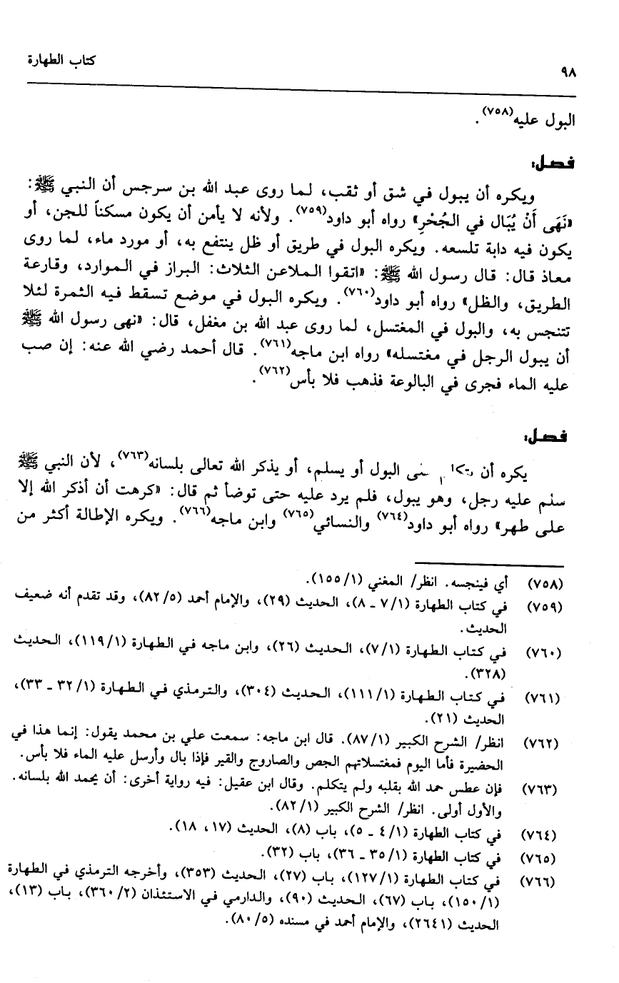 ويكره أن يبول في شق أو ثقب، لما روى عبد الله بن سرجس أن النبي - صَلَّى اللَّهُ عَلَيْهِ وَسَلَّمَ -: «نهى أن يبال في الجحر» رواه أبو داود. ولأنه لا يأمن أن يكون مسكنا للجن، أو يكون فيه دابة تلسعه، ويكره البول في طريق أو ظل ينتفع به، أو مورد ماء، لما روى معاذ قال: قال رسول الله - صَلَّى اللَّهُ عَلَيْهِ وَسَلَّمَ -: «اتقوا الملاعن الثلاث: البراز في الموارد، وقارعة الطريق، والظل» رواه أبو داود، ويكره البول في موضع تسقط فيه الثمرة لئلا تتنجس به، والبول في المغتسل، لما روى عبد الله بن مغفل قال: «نهى رسول الله - صَلَّى اللَّهُ عَلَيْهِ وَسَلَّمَ - أن يبول الرجل في مغتسله» رواه ابن ماجه. قال أحمد - رَضِيَ اللَّهُ عَنْهُ -: إن صب عليه الماء فجرى في البالوعة فذهب فلا بأس.