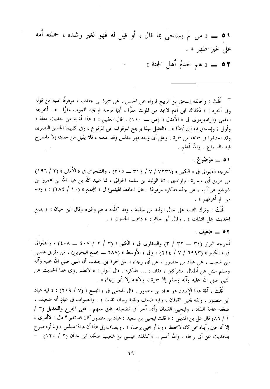 = فكان يقول: ((لأن أزني أحب إلي من أروي عن يزيد)) !! وبالجملة فالحديث ضعيف من رواية عباد بن منصور، شديد الضعف من حديث أنس وحديث أنس هذا عزاه السيوطي في ((الدر المنثور)) (4/ 168) لقاسم بن أصبغ وابن عبد البر وأما حديث سمرة فضعفه الحافظ العراقي كما في ((المغني)) (4/ 31) . والله أعلم.
