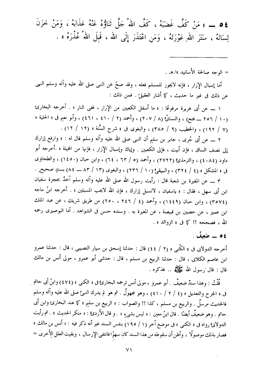قلت: وهذا سند ضعيف. وأبو عمرو، مولى أنس ترجمه البخاري في ((الكنى)) (474) وابن أبي حاتم في ((الجرح والتعديل)) (4/ 2/ 410) ، وهو مجهول. ثم هو لم يدرك النبي صلى الله عليه وأله وسلم فالحديث مرسل. والربيع بن مسلم، كذا!! والصواب: ((الربيع بن سليم)) كما عند البخاري وابن أبي حاتم. وهو ضعيف أيضاً. قال ابن معين: ((ليس بشيء)) وقال الأزدي: ((منكر الحديث)) . ثم رأيت الدولابي رواه في ((الكنى)) في موضع آخر (1/ 195) بنفس غير أنه ذكر فيه: ((أنس بن مالك)) فصار بذلك موصولاً، وأظن أن سقوطه من هذا السند كان سهواً فانتفى الإرسال، وبقيت العلل الأخرى وله شاهد عن حديث ابن عمر رضي الله عنهما. أخرجه ابن أبي الدنيا في ((الصمت)) (ج 1/ ق / 4/ 2- 5/ 1) من طريق المغيرة بن مسلم، عن هشام بن إبراهيم، عن ابن عمر مرفوعاً.. فذكره. مع تقديم وتأخير. قلت: وهذا سند ضعيف. هشام بن إبراهيم، كذا وقع في ((الأصل)) ، وقد ترجم له البخاري (4/ 2/ 192) ، وابن أبي حاتم (4/ 2/ 53) باسم (0 هشام بن أبي 'إبراهيم)) . وقد ترجم له البخاري (4/ 2/ 192) ، وابن أبي حاتم (4/ 2/ 53) باسم ((هشام بن أبي إبراهيم)) . وقد نبه المحقق في حاشية ((الجرح والتعديل)) أن في إحدى نسخ الكتاب ((هشام بن إبراهيم)) . وهو على كل حال مجهول كما قال أبو حاتم. قال الحافظ العراقي في ((المغني)) (3/ 110) . ((رواه ابن أبي الدنيا في ((الصمت)) بسند حسن)) !! قلت: كذا قال! وهو متعقب فيه ذكرت. والحديث عزاه الزبيدي في ((الإتحاف)) (7/ 452- 453) إلى أبي يعلى، وابن شاهين، والخرائطي في ((مساوئ الأخلاق)) والضياء في ((المختارة)) . والله أعلم.