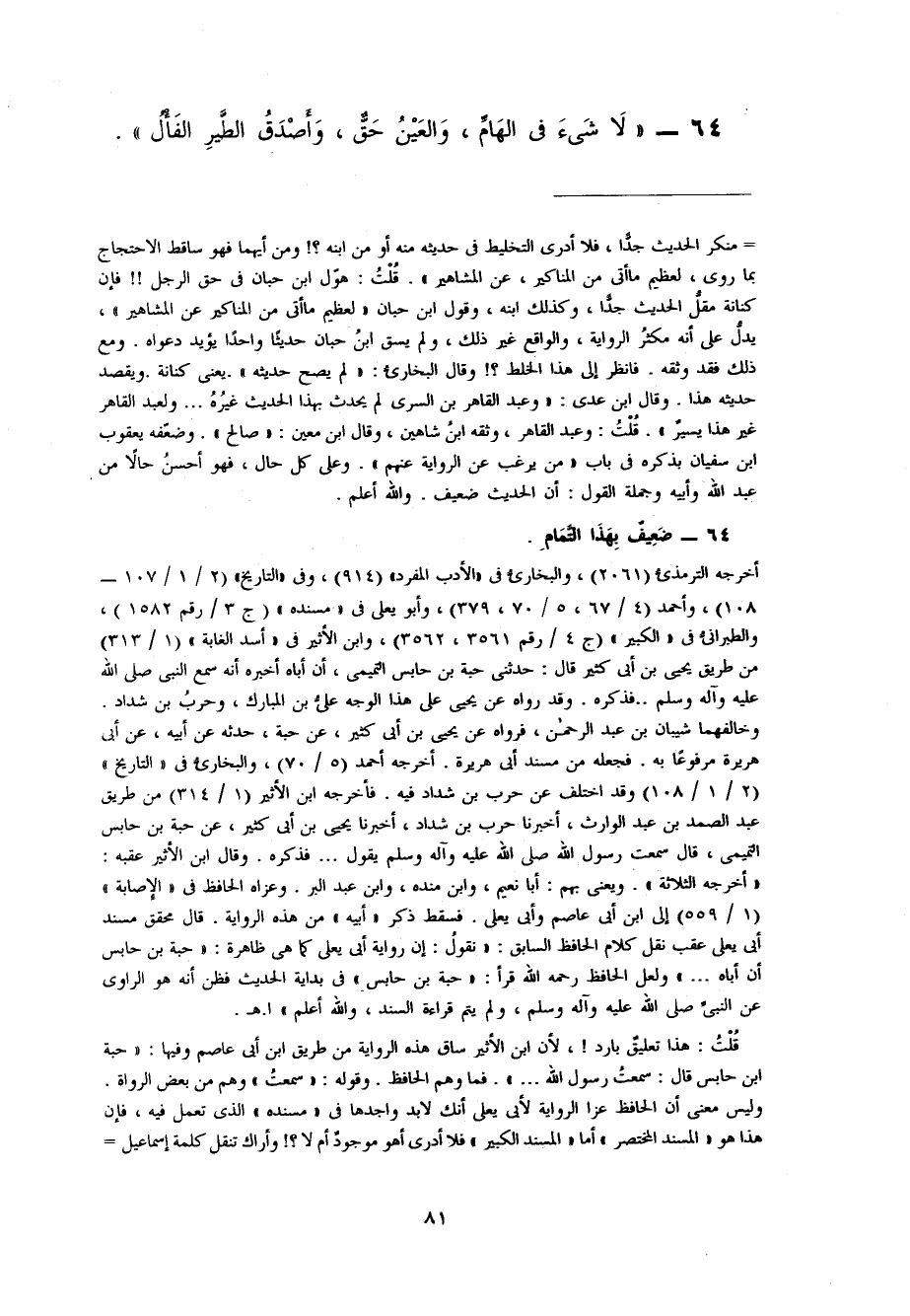 (( ... ثقة كانَ لهُ عن يحيى بن أبي كثير كتابان، أحدهما سماع والآخر إرسال، فحديث الكوفيين عنهُ فيهِ شيء)) أ. هـ. والذين رووا عنهُ هَذَا الحديث بصريون كعبد الملك بن عمرو والقيسي وعبد الصمد بن عبد الوارث، ويحيى بن كثير العنبري. الثاني: أن أبان العطار لم يتابع شيبان النحوي وبيانه: أن شيبان يرويه، عن يحيى، عن حبة، عن أبيه، عن أبي هريرة. وأبان بن يزيد العطار يرويه عن يحيى أن رجلا حدثه عن أبي هريرة كذا وقع في ((التاريخ)) للبخاري. ثمَّ رأيت الحافظ في ((الإصابة)) (1/ 559) = = قدْ رجح الوجه الذي اخترناه. فالحمد لله على التوفيق. وإذا قدْ رجحنا الوجه الأول. فإنه ضعيف أيضا ذلكَ أن ((حبة)) بالموحدة أو ((حية)) بالمثناة التحتانية مجهول العين والصفة، لم يرو عنهُ إلا يحيى بن أبي كثير. وهذا هو علة الحديث. والله أعلم. ولذا قالَ الترمذي: ((حديث غريب)) وله شاهد من حديث أبي أمامة - رضي الله عنه -. أخرجه الطبراني في ((الكبير)) (ج 8/ رقم 7686) من طريق عفير بن معدان، وهوَ ضعيف)) . وقال مرة (1/300) : ((ضعيف جداً؛!! ولفقرات الحديث شواهد. بعضها في ((الصحيحين)) . والله أعلم.
