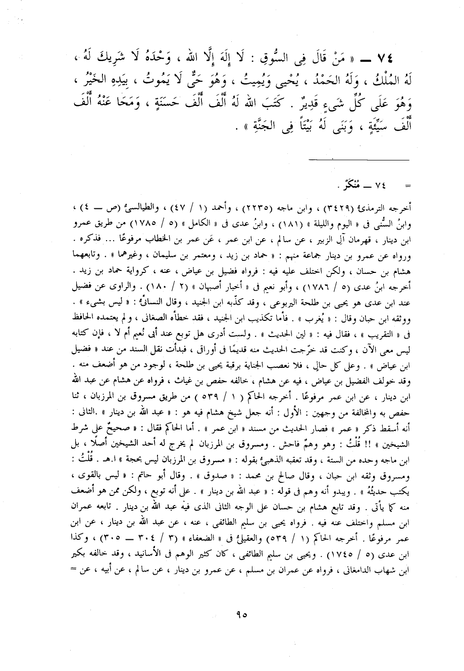 74- ((منْ قالَ في السوقِ: لا إلهَ إلا اللهُ، وحدهُ لا شَريكَ لَهُ، لَهُ الملكُ، ولَهُ الحَمدُ، يُحيي ويُميتُ، وَهُو حيٌ لا يموتُ، بِيدِهِ الخيرُ، وَهُوَ عَلَى كُلِّ شيءٍ قَديرٌ. كَتَبَ اللهُ لَهُ ألفَ ألفَ حسنةٍ، وَمَحَا عَنهُ ألفَ ألفَ سَيئةٍ، وَبنى لَهُ بَيتاً في الجنَّةِ)) . (¬1)