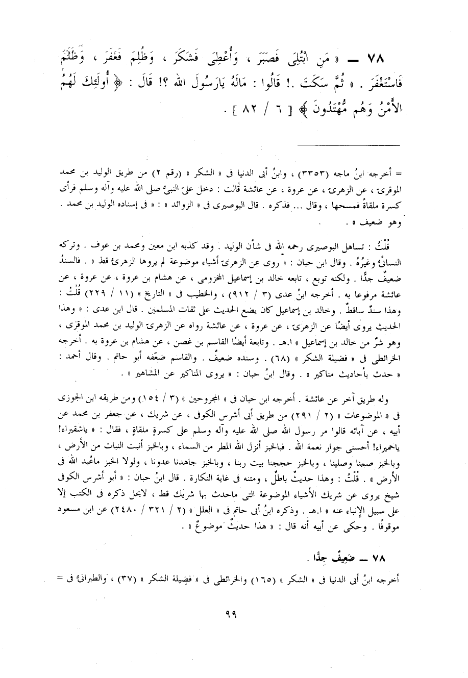 78- ((مَنِ ابْتُليَ فَصَبرَ، وأعطَى فَشَكرَ، وَظُلِمَ فَغَفرَ، وَظَلمَ فاسْتَغفَرَ.)) ثُمَّ سَكَتَ.! قَالوا: مَا لَهُ يَا رسولَ اللهِ؟! قَالَ: {أُولَئِكَ لَهُمُ الأَمْنُ وَهُمْ مُهْتَدُونَ} [6/82] . (¬1)
