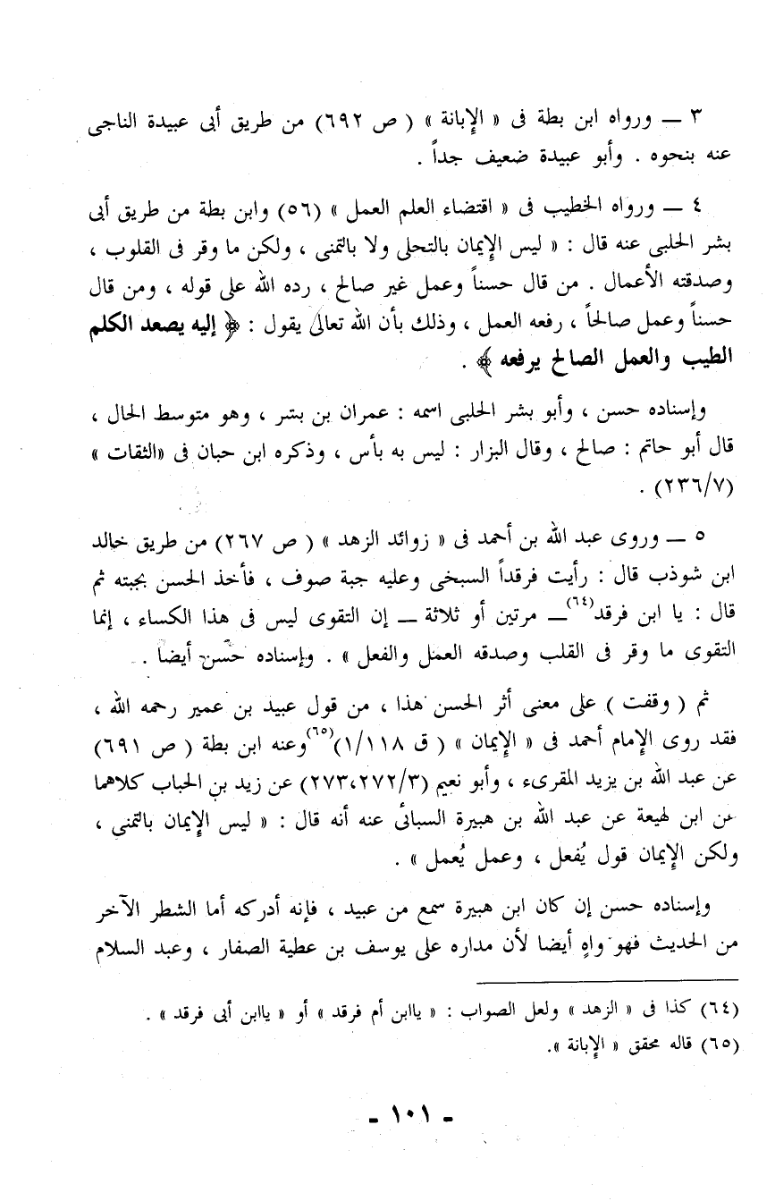 4 - ورواه الخطيب في "اقتضاء العلم العمل" (56) وابن بطة من طريق أبي بشر الحلبي عنه قال: "ليس الإِيمان بالتحلى ولا بالتمنى، ولكن ما وقر في القلوب، وصدقته الأعمال. من قال حسنًا وعمل غير صالح، رده الله على قوله، ومن قال حسنًا وعمل صالحًا، رفعه العمل، وذلك بأن الله تعالى يقول: {إِلَيْهِ يَصْعَدُ الْكَلِمُ الطَّيِّبُ وَالْعَمَلُ الصَّالِحُ يَرْفَعُهُ}.