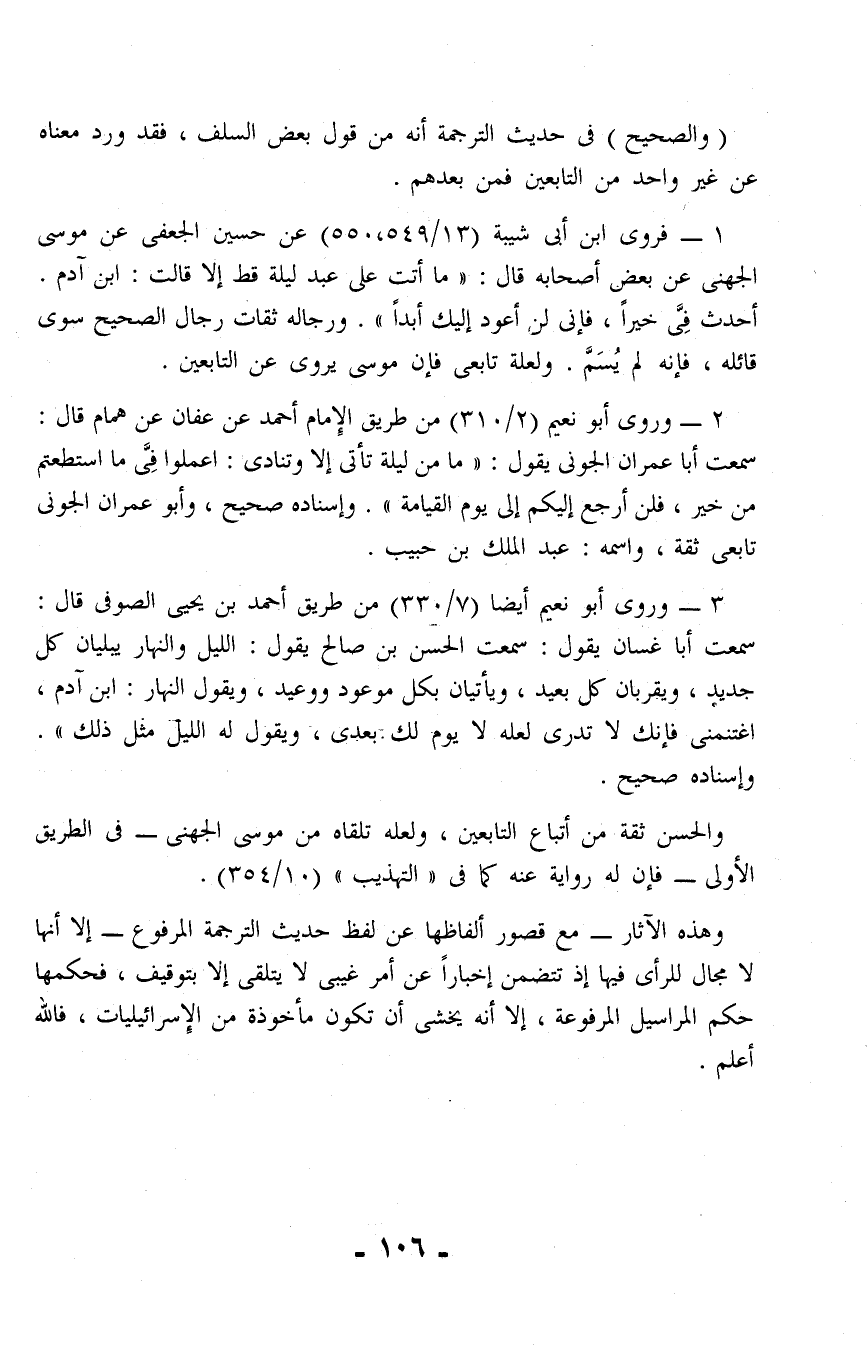 2 - وروى أبو نعيم (2/ 310) من طريق الإِمام أحمد عن عفان عن همام قال: سمعت أبا عمران الجونى يقول: "ما من ليلة تأتى إلا وتنادى: اعملوا فِىَّ ما استطعتم من خير، فلن أرجع إليكم إلى يوم القيامة". وإسناده صحيح، وأبو عمران الجونى تابعى ثقة، واسمه: عبد الملك بن حبيب.