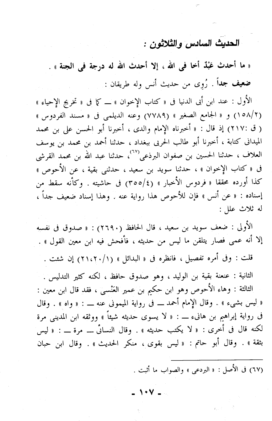 الثانية: عنعنة بقية بن الوليد، وهو صدوق حافظ، لكنه كثير التدليس. الثالثة: وهاء الأحوص وهو ابن حكيم بن عمير العَنْسى، فقد قال ابن معين: "ليس بشئ". وقال الإِمام أحمد -فى رواية الميمونى عنه-: "واه". وقال فى رواية إبراهيم بن هانئ-: "لا يسوى حديثه شيئًا" ووثقه ابن المدينى مرة لكنه قال فى أخرى: "لا يكتب حديثه". وقال النسائى -مرة-: "ليس بثقة". وقال أبو حاتم: "ليس بقوى، منكر الحديث". وقال ابن حبان (1/ 175):