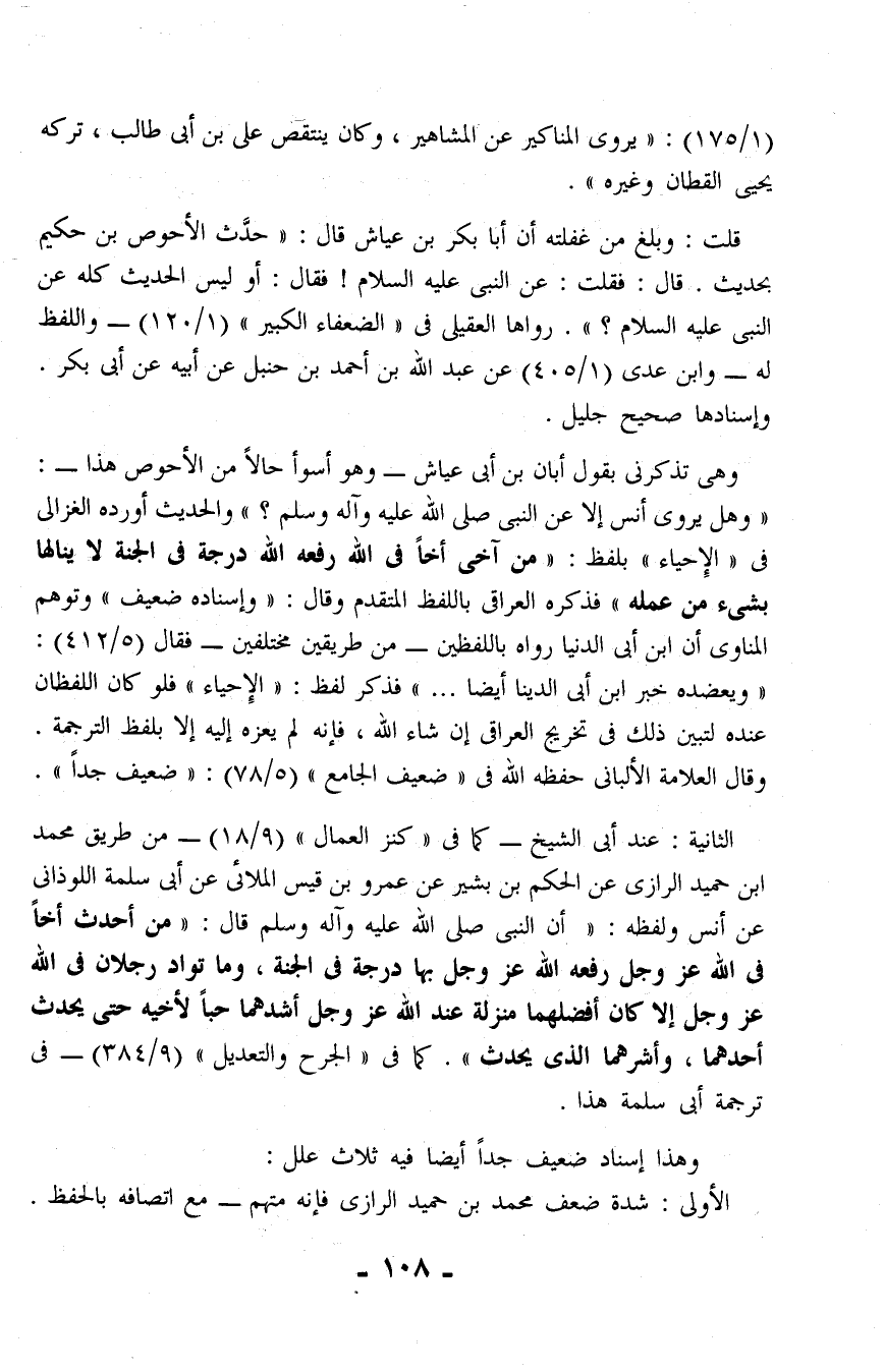 وهى تذكرنى يقول أبان بن أبي عياش -وهو أسوأ حالًا من الأحوص هذا-: "وهل يروى أنس إلا عن النبى صلى الله عليه وآله وسلم؟ " والحديث أورده الغزالى فى "الإِحياء" بلفظ: "من آخى أخًا فى الله رفعه الله درجة فى الجنة لا ينالها بشئ من عمله" فذكره العراقى باللفظ المتقدم وقال: "وإسناده ضعيف" وتوهم المناوى أن ابن أبي الدنيا رواه باللفظين -من طريقين مختلفين- فقال (5/ 412): "ويعضده خبر ابن أبي الدينا أيضًا ... " فذكر لفظ: "الإِحياء" فلو كان اللفظان عنده لتبين ذلك فى تخريج العراقى إن شاء الله، فإنه لم يعزه إليه إلا بلفظ الترجمة. وقال العلامة الألبانى حفظه الله فى "ضعيف الجامع" (5/ 78): "ضعيف جدًا".
