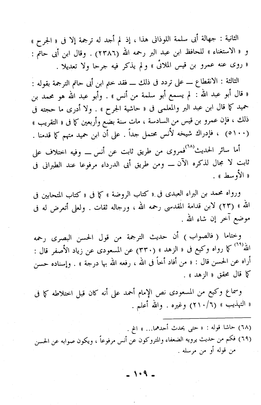 الثالثة: الانقطاع -على تردد في ذلك- فقد ختم ابن أبي حاتم الترجمة بقوله: "قال أبو عبد الله: لم يسمع أبو سلمة من أنس". وأبو عبد الله هو محمد بن حميد كما قال ابن عبد البر والمعلمى في "حاشية الجرح". ولا أدرى ما حجته في ذلك، فإن عمرو بن قيس من السادسة، مات سنة بضع وأربعين كما في "التقريب" (5100)، فإدراك شيخه لأنس محتمل جدًا. على أن ابن حميد متهم كما قدمنا.