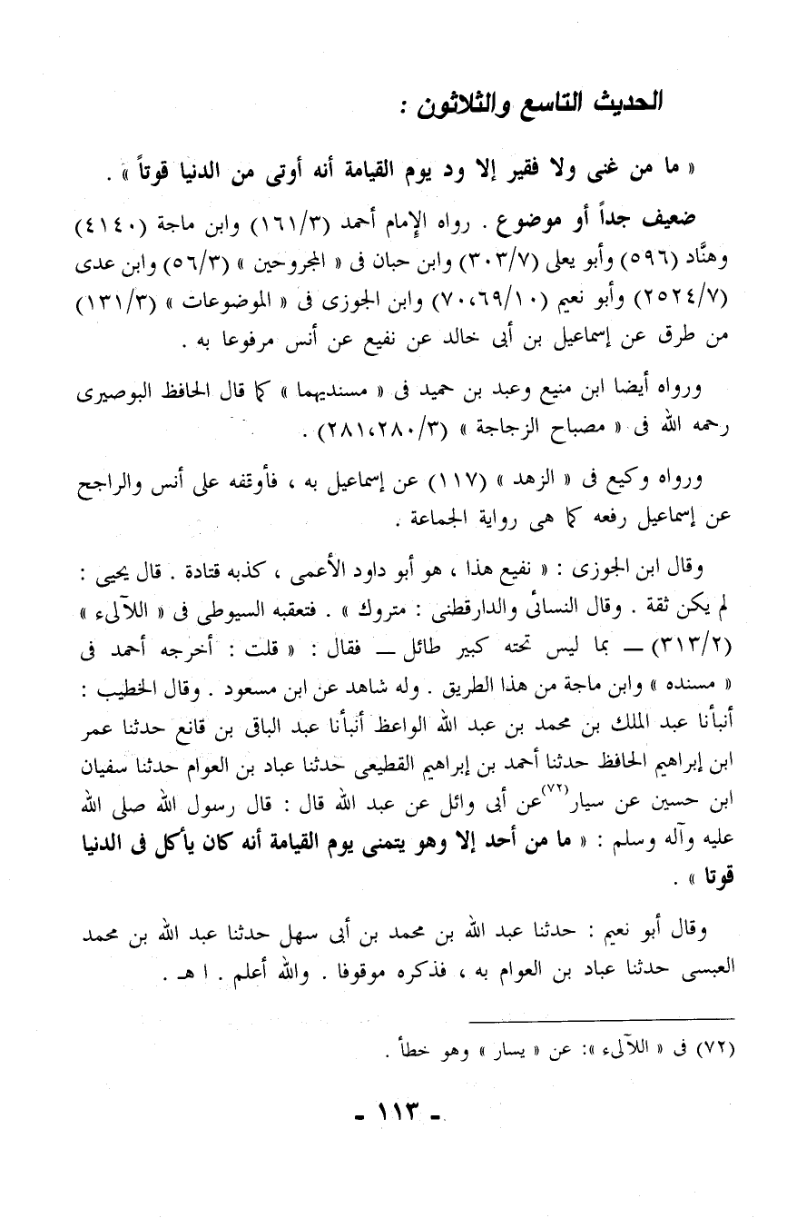 وقال ابن الجوزى: "نفيع هذا، هو أبو داود الأعمى، كذبه قتادة. قال يحيى: لم يكن ثقة. وقال النسائى والدارقطنى: متروك". فتعقبه السيوطى في "اللآلئ" (2/ 313) - بما ليس تحته كبير طائل - فقال: "قلت: أخرجه أحمد في "مسنده" وابن ماجة من هذا الطريق. وله شاهد عن ابن مسعود. وقال الخطيب: أنبأنا عبد الملك بن محمد بن عبد الله الواعظ أنبأنا عبد الباقى بن قانع حدثنا عمر ابن إبراهيم الحافظ حدثنا أحمد بن إبراهيم القطيعى حدثنا عباد بن العوام حدثنا سفيان ابن حسين عن سيار (¬72) عن أبي وائل عن عبد الله قال: قال رسول الله صلى الله عليه وآله وسلم: "ما من أحد إلا وهو يتمنى يوم القيامة أنه كان يأكل في الدنيا قوتا".