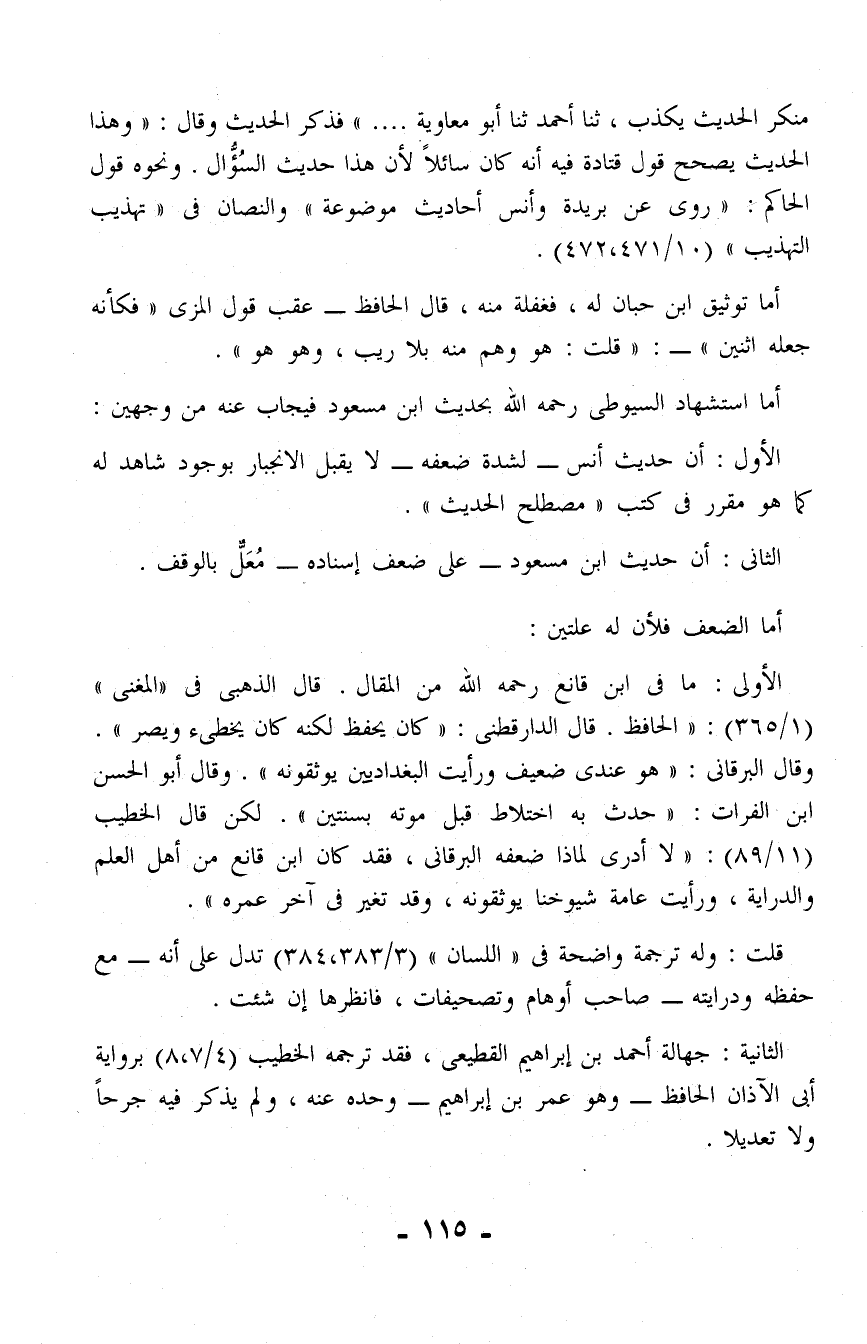 الأولى: ما في ابن قانع رحمه الله من المقال. قال الذهبي في "المغنى" (1/ 365): "الحافظ. قال الدارقطني: "كان يحفظ لكنه كان يخطئ ويصر". وقال البرقاني: "هو عندى ضعيف ورأيت البغداديين يوثقونه". وقال أبو الحسن ابن الفرات: "حدث به اختلاط قبل موته بسنتين". لكن قال الخطيب (11/ 89): "لا أدرى لماذا ضعفه البرقاني، فقد كان ابن قانع من أهل العلم والدراية، ورأيت عامة شيوخنا يوثقونه، وقد تغير في آخر عمره".