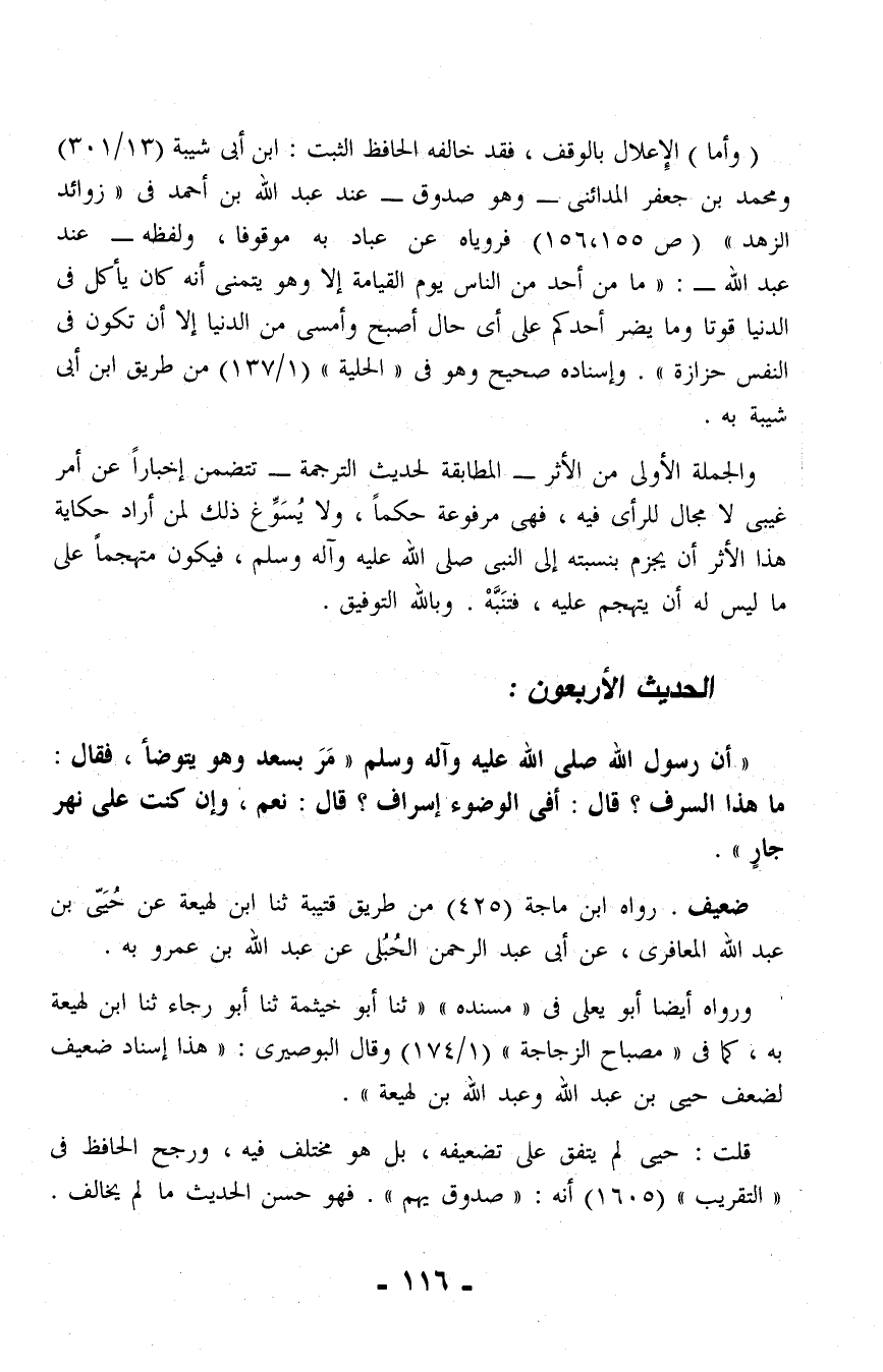 " أن رسول الله صلى الله عيه وآله وسلم "مَرَ بسعد وهو يتوضأ، فقال: ما هذا السرف؟ قال: أفى الوضوء إسراف؟ قال: نعم، وإن كنت على نهر جارٍ".