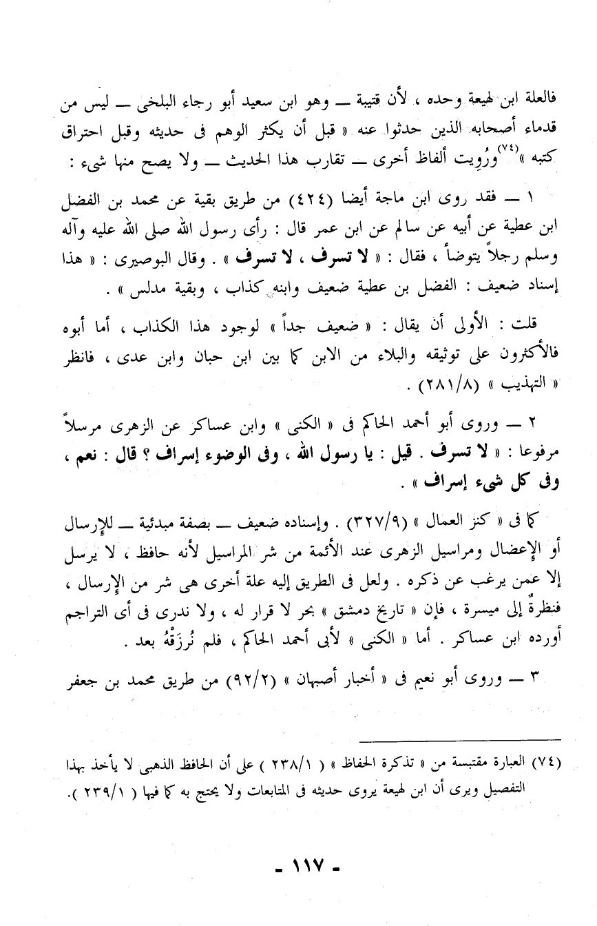 1 - فقد روى ابن ماجة أيضًا (424) من طريق بقية عن محمد بن الفضل ابن عطية عن أبيه عن سالم عن ابن عمر قال: رأى رسول الله صلى الله عليه وآله وسلم رجلًا يتوضأ، فقال: "لا تسرف، لا تسرف". وقال البوصيرى: "هذا إسناد ضعيف: الفضل بن عطية ضعيف وابنه كذاب، وبقية مدلس".