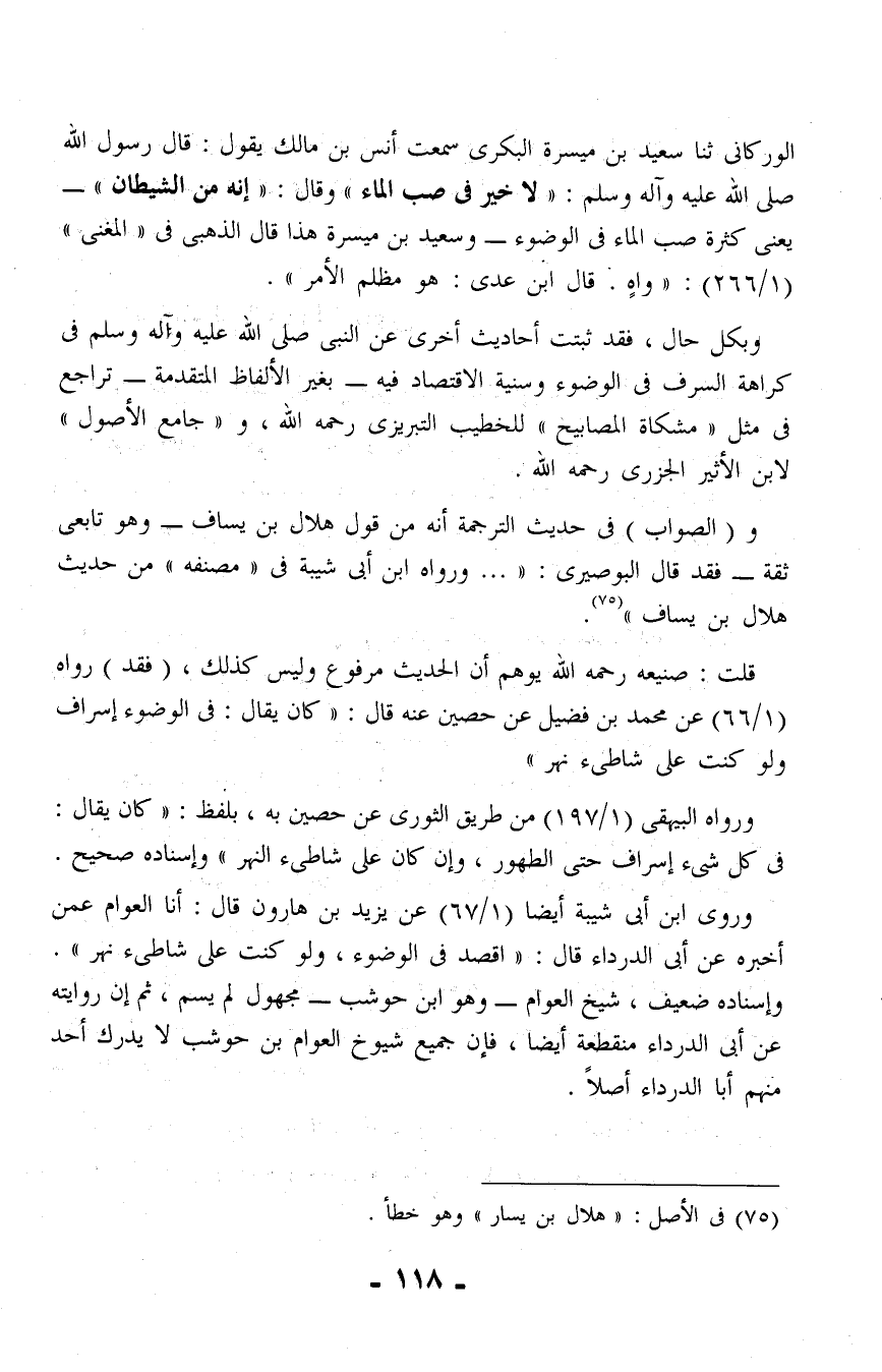 الوركانى ثنا سعيد بن ميسرة البكرى سمعت أنس بن مالك يقول: قال رسول الله صلى الله عليه وآله وسلم: "لا خير في صب الماء" وقال: "إنه من الشيطان" - يعنى كثرة صب الماء في الوضوء- وسعيد بن ميسرة هذا قال الذهبي في "المغنى" (1/ 266): "واهٍ. قال ابن عدي: هو مظلم الأمر".