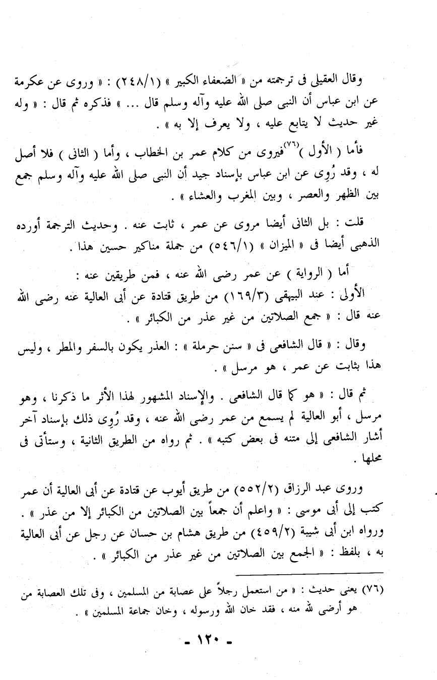 وروى عبد الرزاق (2/ 552) من طريق أيوب عن قتادة عن أبي العالية أن عمر كتب إلى أبي موسى: "واعلم أن جمعًا بين الصلاتين من الكبائر إلا من عذر". ورواه ابن أبي شيبة (2/ 459) من طريق هشام بن حسان عن رجل عن أبي العالية به، بلفظ: "الجمع بين الصلاتين من غير عذر من الكبائر".