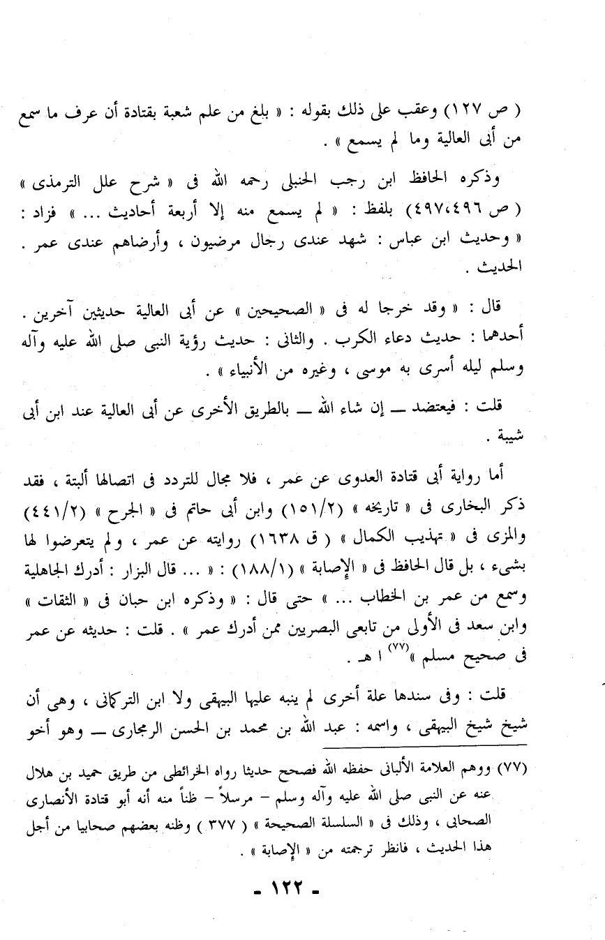 (ص 127) وعقب على ذلك بقوله: "بلغ من علم شعبة بقتادة أن عرف ما سمع من أبي العالية وما لم يسمع".