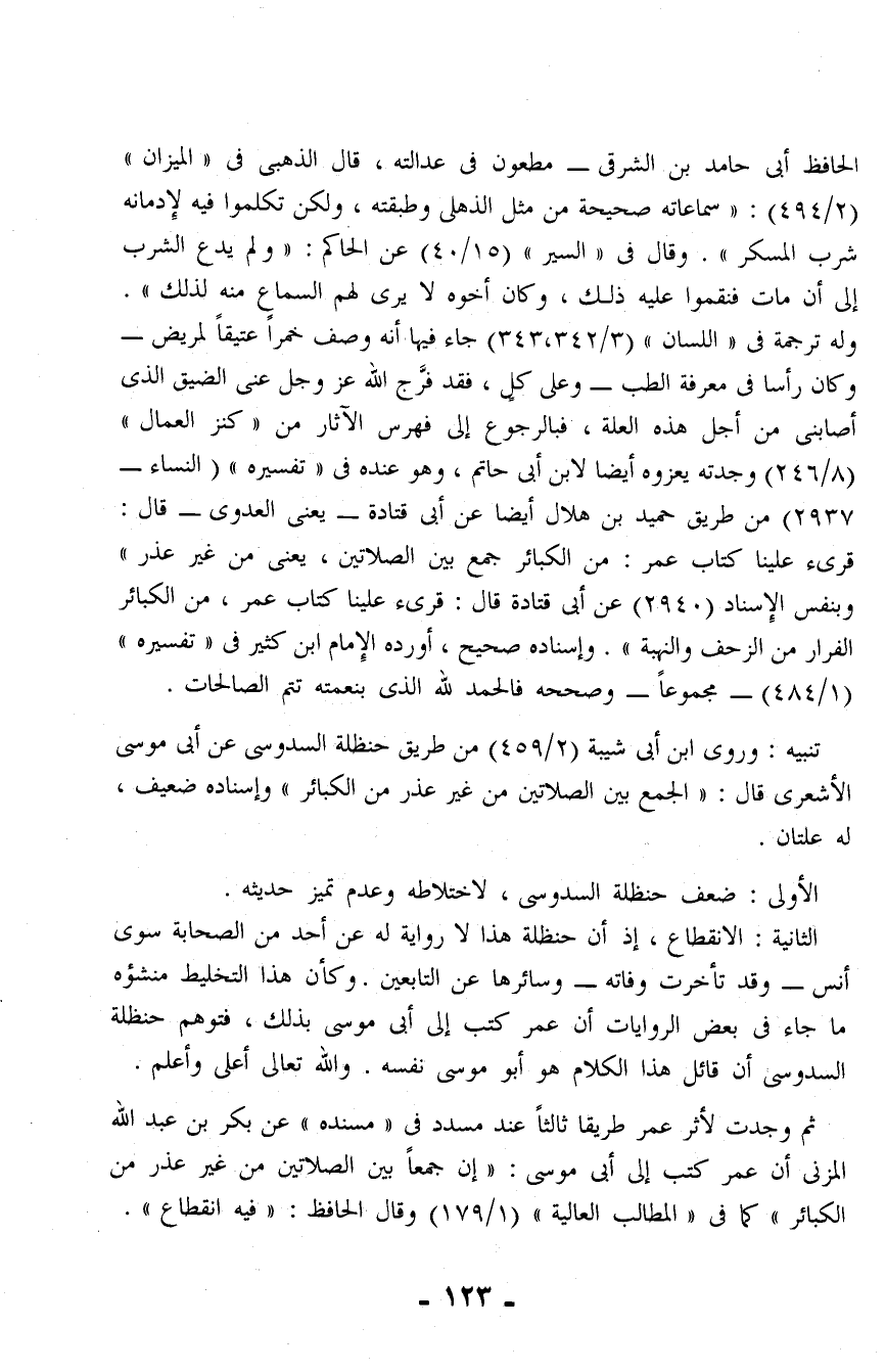 الحافظ أبي حامد بن الشرقى- مطعون في عدالته، قال الذهبي في "الميزان" (2/ 494): "سماعاته صحيحة من مثل الذهلى وطبقته، ولكن تكلموا فيه لإِدمانه شرب المسكر". وقال في "السير" (15/ 40) عن الحاكم: "ولم يدع الشرب إلى أن مات فنقموا عليه ذلك، وكان أخوه لا يرى لهم السماع منه لذلك". وله ترجمة في "اللسان" (3/ 342, 343) جاء فيها أنه وصف خمرًا عتيقًا لمريض - وكان رأسا في معرفة الطب - وعلى كلٍ، فقد فرَّج الله عز وجل عنى الضيق الذى أصابنى من أجل هذه العلة، فبالرجوع إلى فهرس الآثار من "كنز العمال" (8/ 246) وجدته يعزوه أيضًا لابن أبي حاتم، وهو عنده في "تفسيره" (النساء - 2937) من طريق حميد بن هلال أيضًا عن أبي قتادة -يعنى العدوى- قال: قرئ علينا كتاب عمر: من الكبائر جمع بين الصلاتين، يعنى من غير عذر" وبنفس الإِسناد (2940) عن أبي قتادة قال: قرئ علينا كتاب عمر، من الكبائر الفرار من الزحف والنهبة". وإسناده صحيح، أورده الإِمام ابن كثير في "تفسيره" (1/ 484) -مجموعًا- وصححه فالحمد لله الذى بنعمته تتم الصالحات.
