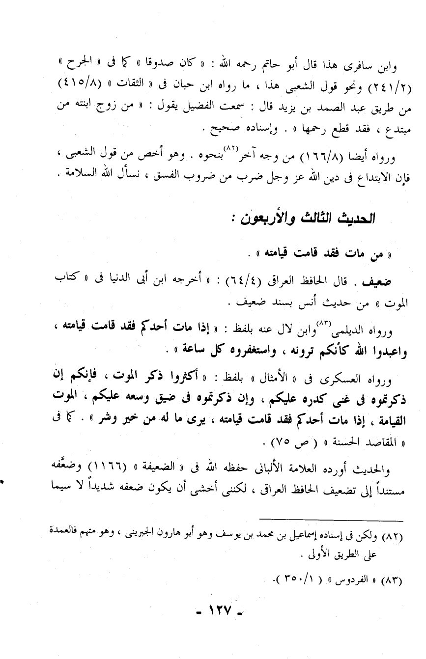 ورواه الديلمي (¬83) وابن لال عنه بلفظ: "إذا مات أحدكم فقد قامت قيامته، واعبدوا الله كأنكم ترونه، واستغفروه كل ساعة".